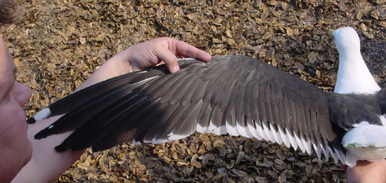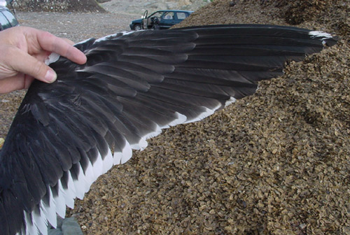 450 mm.  Ringed as adult at Tampere, Finland on August 11 2002. This individual was ringed CNMP and metal ring HT-238.598, showing two mirrors, one large mirror on P10 and one smaller mirror on P9, indicating this is most probably a male. The tail is worn at the tips. Primary moult has started with P1 shed and P2-P10 still old. Length of wing-tip to elbow: 450 mm, much in line with the stronger and larger Larus argentatus argentatus caught at the same spot, the same day. This clearly demonstrates why the general impression of fuscus in flight is that of a long-winged and slender-wing gull. Note the sub-terminal band on P4, bordered by a thin white line. In the left wing, P5 was damaged.