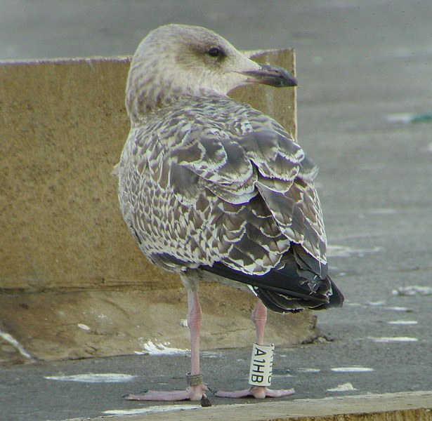A bird from the U.K., from the British ring-project in East Sussex. A1HB (BTO GN38346) was found as a small chick in Bexhill, East Sussex on 21st June. It was released on 6th August. It was first seen on the continent on 23/09/02 at Pas de Calais by Camille Deponcheel. An individual with almost all the upper scapulars and a few lower scapulars moulted for second generation feathers. Note the missing rear lower scapulars when viewed from behind.