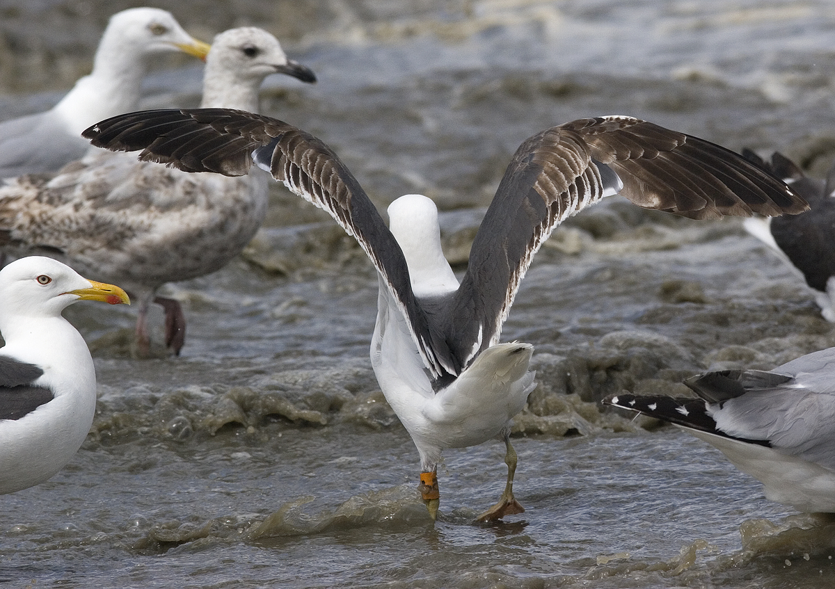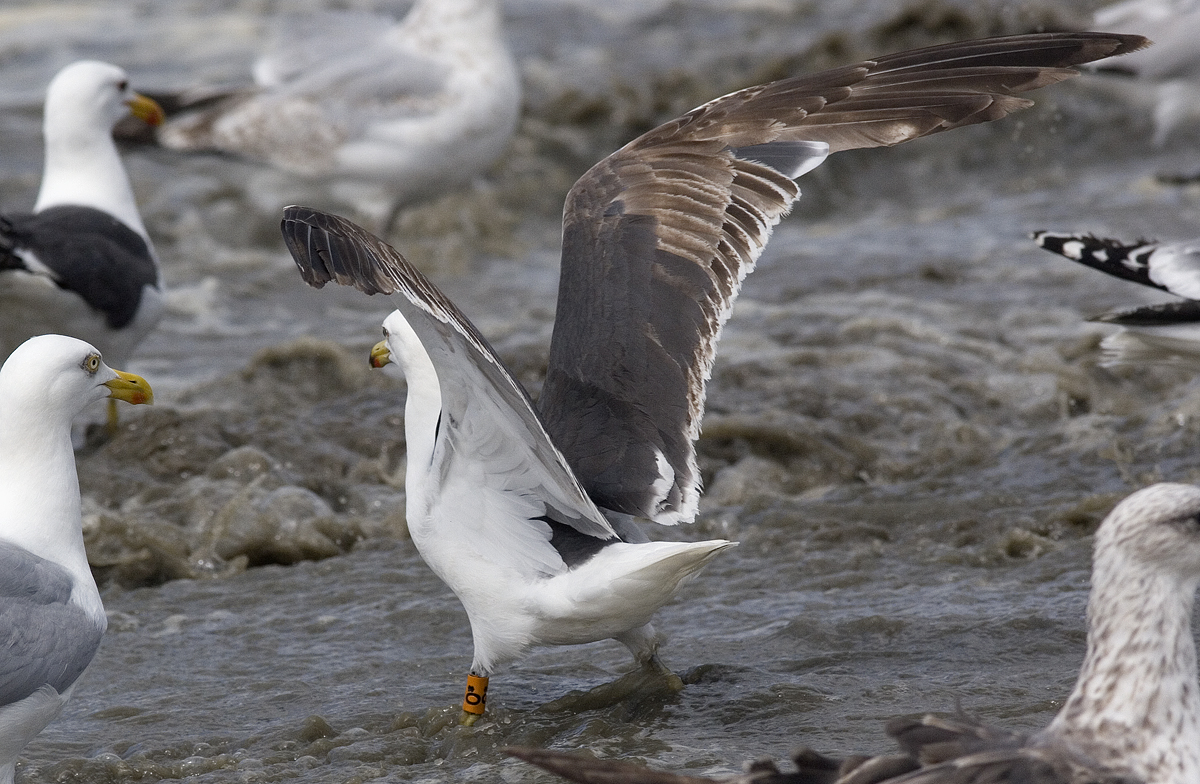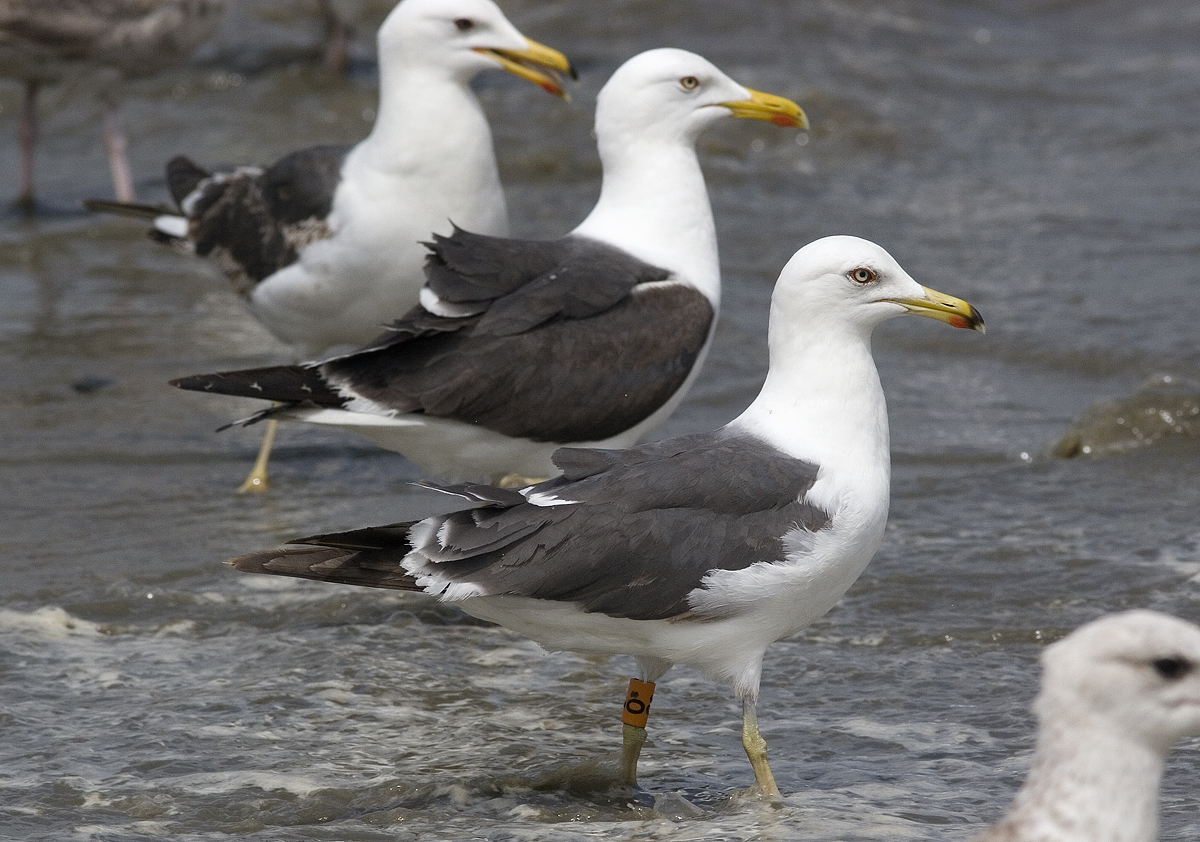 Lesser Black-backed Gull graellsii 0* 3CY & 4CY, June 2013 & May 2014, Noordwijk & Maasvlakte, the Netherlands. Picture: Merijn Loeve & Mars Muusse.Probably ringed as pullus on 02 July 2011 at Maasvlakte (Amazonehaven), Zuid-Holland, Plastic O - 0* and metal NLA 5468089; ringed as pullus on July 04 2011 at Vlissingen-Oost (Van Cittershaven), the Netherlands (5126.00 N 342.00 E), by Roland-Jan Buijs. Recoveries: Lesser Black-backed Gull graellsii 0* 4CY, May 23 2014, Maasvlakte, the Netherlands. Picture: Merijn Loeve.Hard to tell this is not a full adult, when in rest.