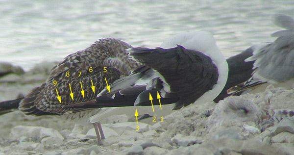 A bird with two moult waves in the wing. The inner primaries have been replaced, with P1-P3 grown, P3 almost fully grown and already longer than P2 and P4 growing. P5 and P6 are slightly older, probably moulted last spring. The outer primaries P7-P10 were moulted last autumn and now appear brown bleached and the small tips worn away. P10 has a clear mirror just reaching the inner-web and reaching the outer-web over a longer distance. Note the white crescent on P5 (between the black sub-terminal band and the grey inner-web), which is lacking on P6. The primaries have been numbered in the bottom picture.