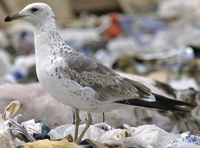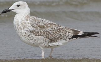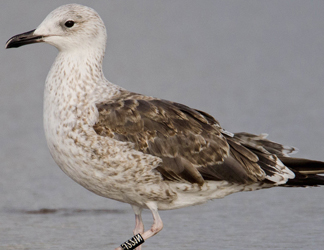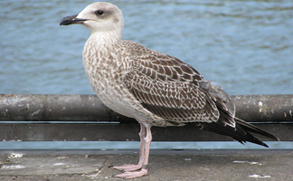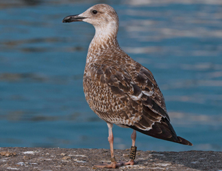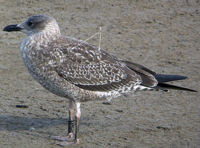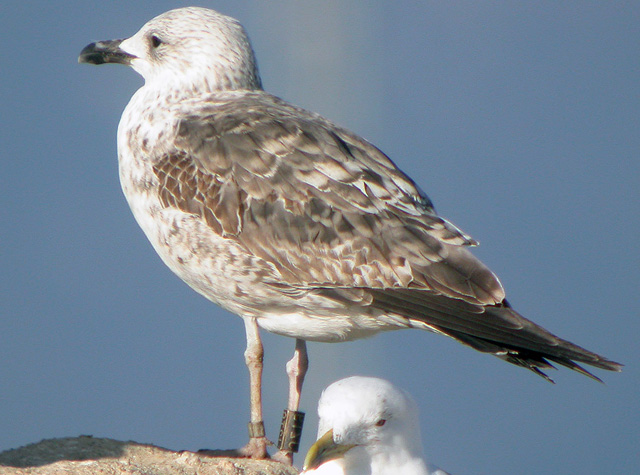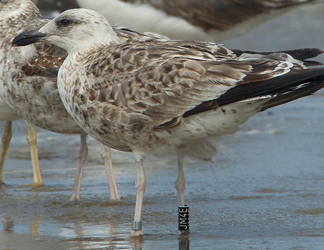 Plate 4: Yellow-legged Gull michahellis ITB CH6147 1CY, July 31 2009, Scheveningen, the Netherlands (Mark Zevenbergen). By the end of July, our young Dutch Herring Gulls still attend the parents in the colony for food, while this Italian Yellow-legged Gull already completed a 1000 km journey northwards and turns up in a Dutch harbour, still in juvenile plumage. |