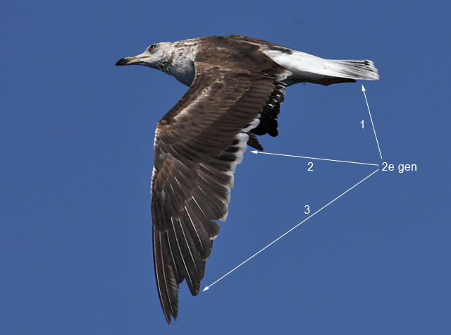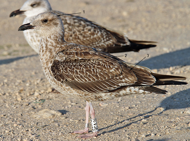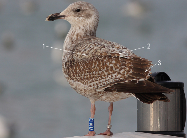 Plate 50: February 09 2013, Calais, France (Jean-Michel Sauvage). Almost all scapulars are 2nd generation (arrow 1); a few long rear scapulars are still juvenile (arrow 2). All wing-coverts and tertials are still juvenile, the white notched parts completely worn away on the latter (arrow 3). This suggests a southern bird, from our latitudes or further south (type II and III). Worn plumage and limited moult can be found in several species: Lesser Black-backed Gull graellsii, Great Black-backed Gull marinus, Herring Gull argenteus or even retarded Yellow-legged Gull michahellis. Broad white bars on the outer greater coverts, together with the notched tertial fringes indicate 1st winter Herring Gull argenteus.