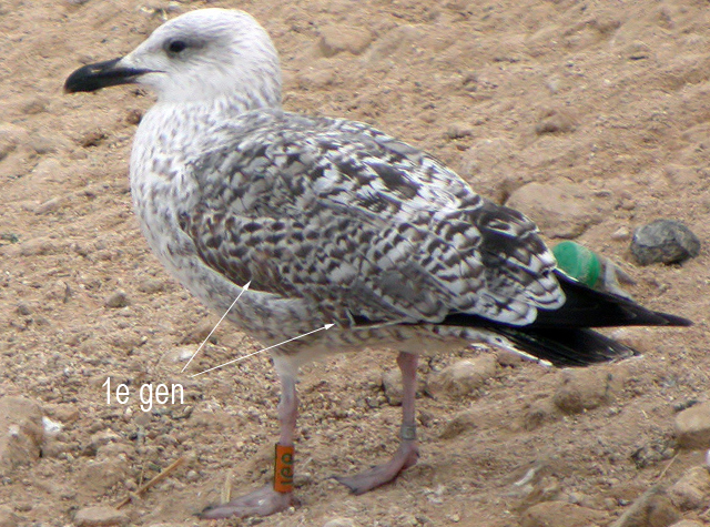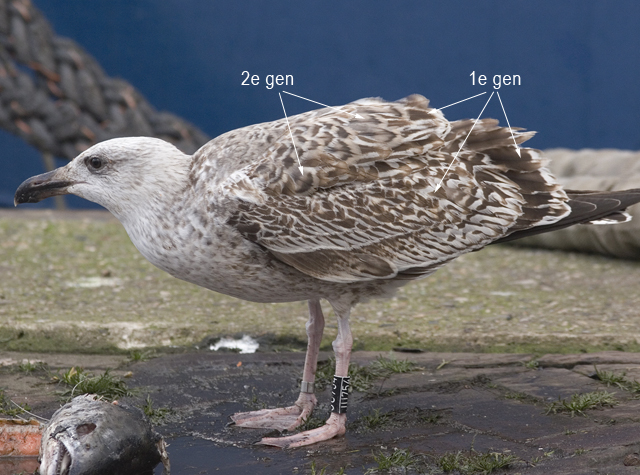 Plate 17: Type III - Yellow-legged Gull michahellis ST3U 1CY, November 16 2016, Katwijk, the Netherlands (Mars Muusse). From Croatia. By November all scapulars replaced, together with inner greater coverts, six inner median coverts and about eight lesser coverts (arrows '2e gen'). Outer coverts and tertials still juvenile. |