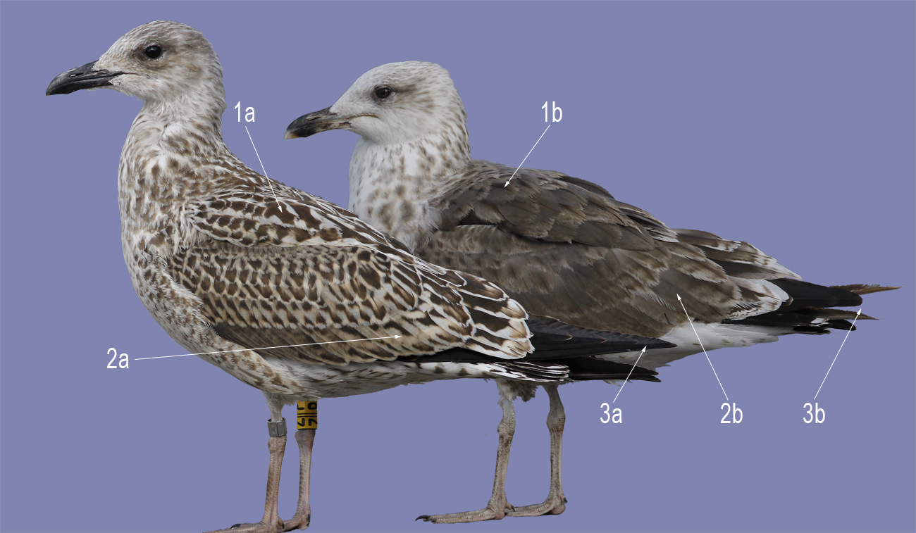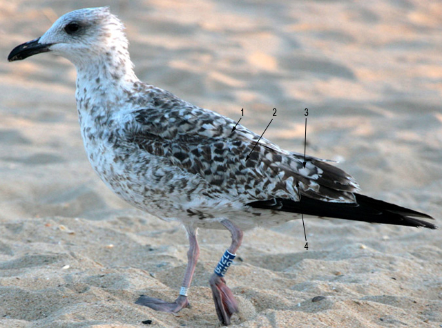Plate 18: Type III - Caspian Gull cachinnans 431P 1CY, November 16 2016, Katwijk, the Netherlands (Mars Muusse). From Poland. Similar to ST3U from Croatia. Type III birds from S Europe show a rapid and extensive moult in autumn which halts early winter. |