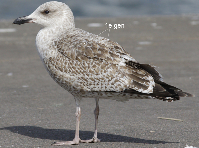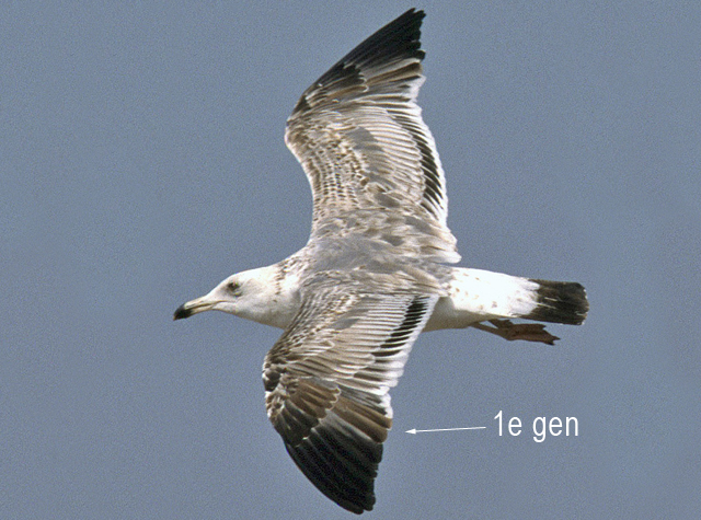 Plate 19: Type III - Yellow-legged Gull michahellis 1G6 1CY, November 15 2009, Madrid, Spain (Delfín González). Advanced bird, which has replaced all scapulars and nearly all visible tertials and wing-coverts by November. Just a few juvenile feathers visible in outer greater coverts and outer lesser coverts (arrows '1e gen'). Tail and primaries will remain juvenile throughout winter and no more coverts will be replaced in this post-juvenile moult. |