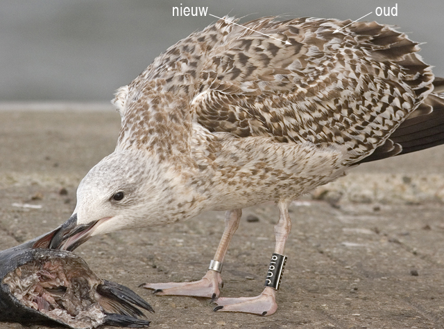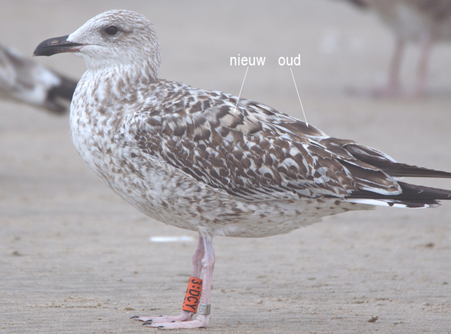 Plate 14: Type II - Great Black-backed Gull marinus JU818 1st cycle, December 20 2014, IJmuiden, the Netherlands (Mars Muusse). Ringed in S Norway. Less advanced than JP140. Most scapulars are 2nd generation (arrow 'nieuw'), while large rear scapulars are still juvenile (arrow 'oud'). In the tertial tips, the white fringes (which lack pigmentation, hence are more vulnerable to wear) are obviously worn. JU818 was still present in April, still with all wing-coverts and all tertials juvenile. |