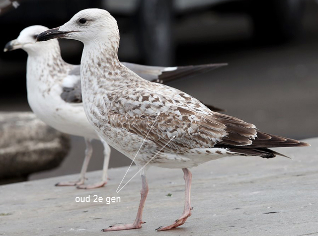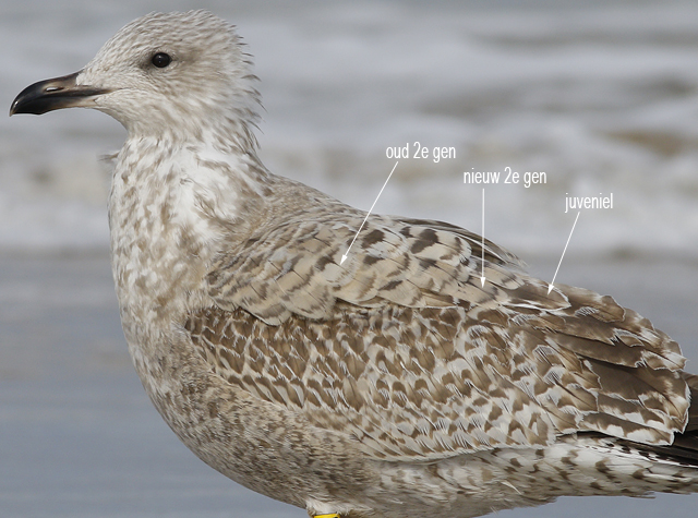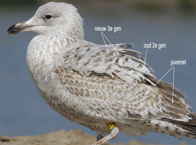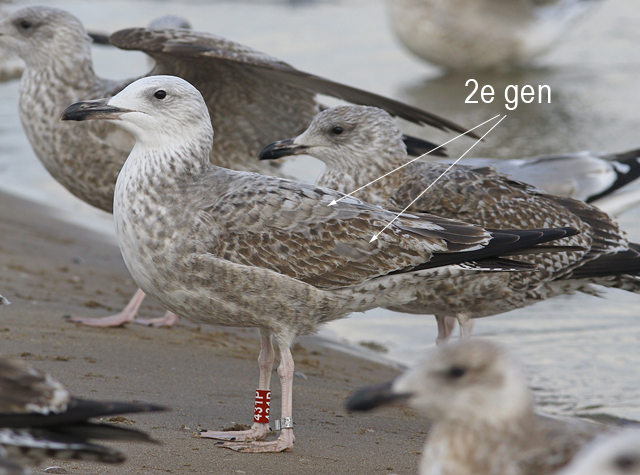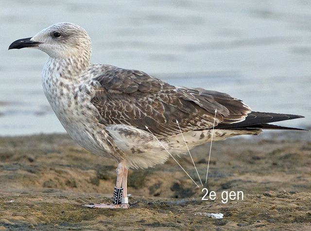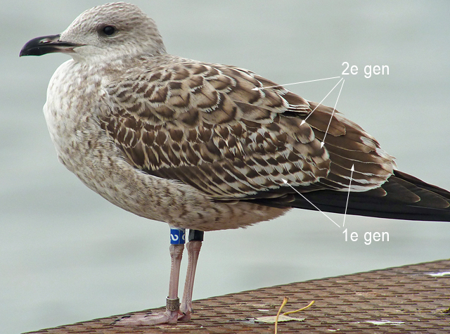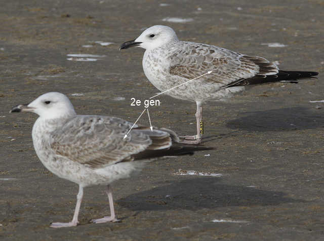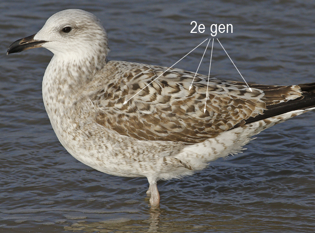 Plate 21: Type III - Caspian Gull cachinnans HCV93 1CY, November 16 2016, Katwijk, the Netherlands (Mars Muusse). From Belarus, with another, unringed Caspian Gull in front. Both birds show new inner coverts and the front bird also has a new tertial (arrows '2e gen'). If 2nd generation coverts are present, it's often the median coverts that are replaced, as these birds show. |