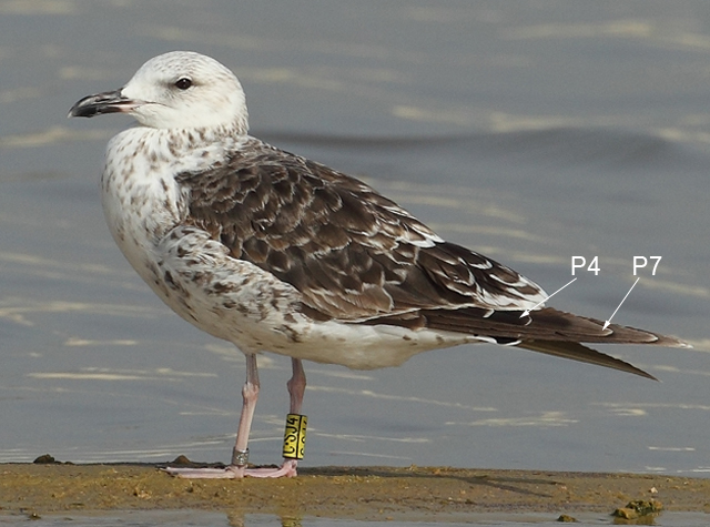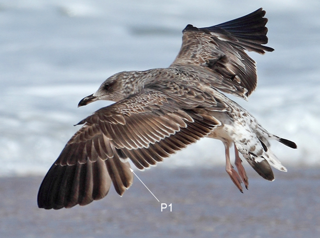 Juvenile Herring Gulls have blackish brown outer primaries with small white tips (which wear off easily within some weeks). The arrow points to primary #7 (P7). The small last tip is of P10. The tail is visible below P7 in this resting bird. |
