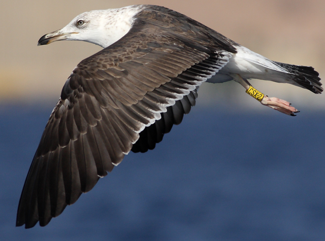 Check: tertial pattern (no notching), outer greater coverts (extensive dark centres), the chocolate brown tone, and broad tail band indicate Lesser Black-backed Gull. Northern birds in Scvandinavia belong to subspecies intermedius. This is 1CY intermedius Lesser Black-backed Gull JR2Y from Troms, Norway (69°N), travelling distance to Anza is 4600 km. |