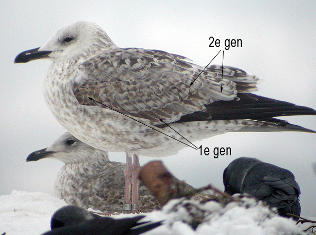Plate 20: Type III - Caspian Gull cachinnans UKK L001754 1st cycle, January 13 2004, Lubna, Poland (Ruud Altenburg). From Ukraine. Many wing-coverts replaced (left arrow '2e gen' points to complete row of 2nd generation median coverts, right arrow points to 2nd generation inner greater coverts). Upper tertials replaced as well. Tail and primaries will remain juvenile, as will the outer wing-coverts (left arrow '1e gen' points to juvenile lesser coverts, right arrow points to juvenile outer greater coverts). |