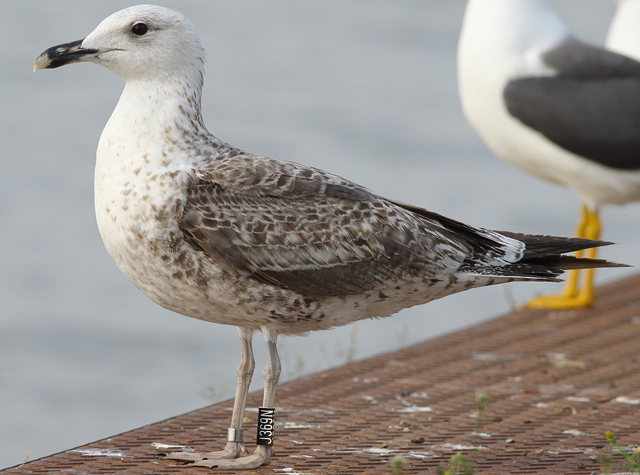 Plate 6: Lesser Black-backed Gull graellsii Z||P juvenile, September 03 2016, Utrecht, the Netherlands (Mars Muusse), together with 2CY Lesser Black-backed Gull (unringed) for comparison (same location, same day).