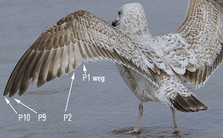 Plate 39: Type V - Baltic Gull fuscus 2CY, March 12 2011, Ashdod, Israel (Amir Ben Dov). P1 is growing, P2 missing, P3-P10 are still juvenile. Sequence of wing-covert moult matches our Herring Gulls in complete moult in summer: growing inner coverts correspond with growing P1.