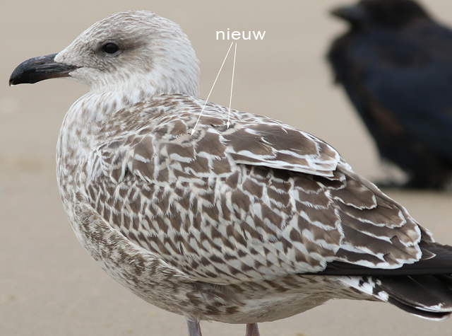 Plate 11: Type II - Herring Gull argenteus 1CY, Augustus 21 2015, Katwijk, the Netherlands (Mars Muusse). From the local rooftop colony, now at the beach. Post-juvenile moult starts immediately after fledging. Arrows 'nieuw' point to new 2nd generation scapulars growing in. Note the buffish tone of these feathers, the delicate anchor pattern and the crisp fringes. |