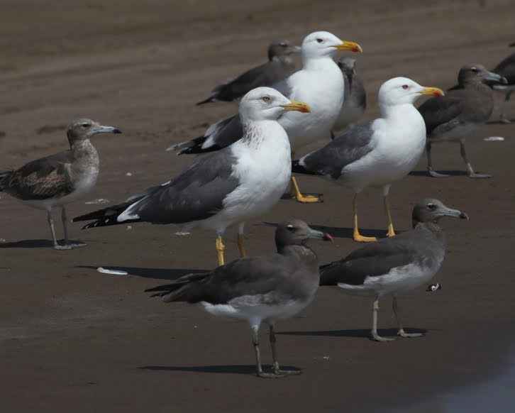 Visit Chris's weblog. Steppe Gull 'barabensis' is the numerically dominant large gull wintering in UAE.        For comparison: two barabensis standing behind adult heuglini. The later primary moult of the heuglini is evident (P10 is still regrowing and so the mirror is visible on the underside of the far wing but is level only with the P6 tip of the near wing).