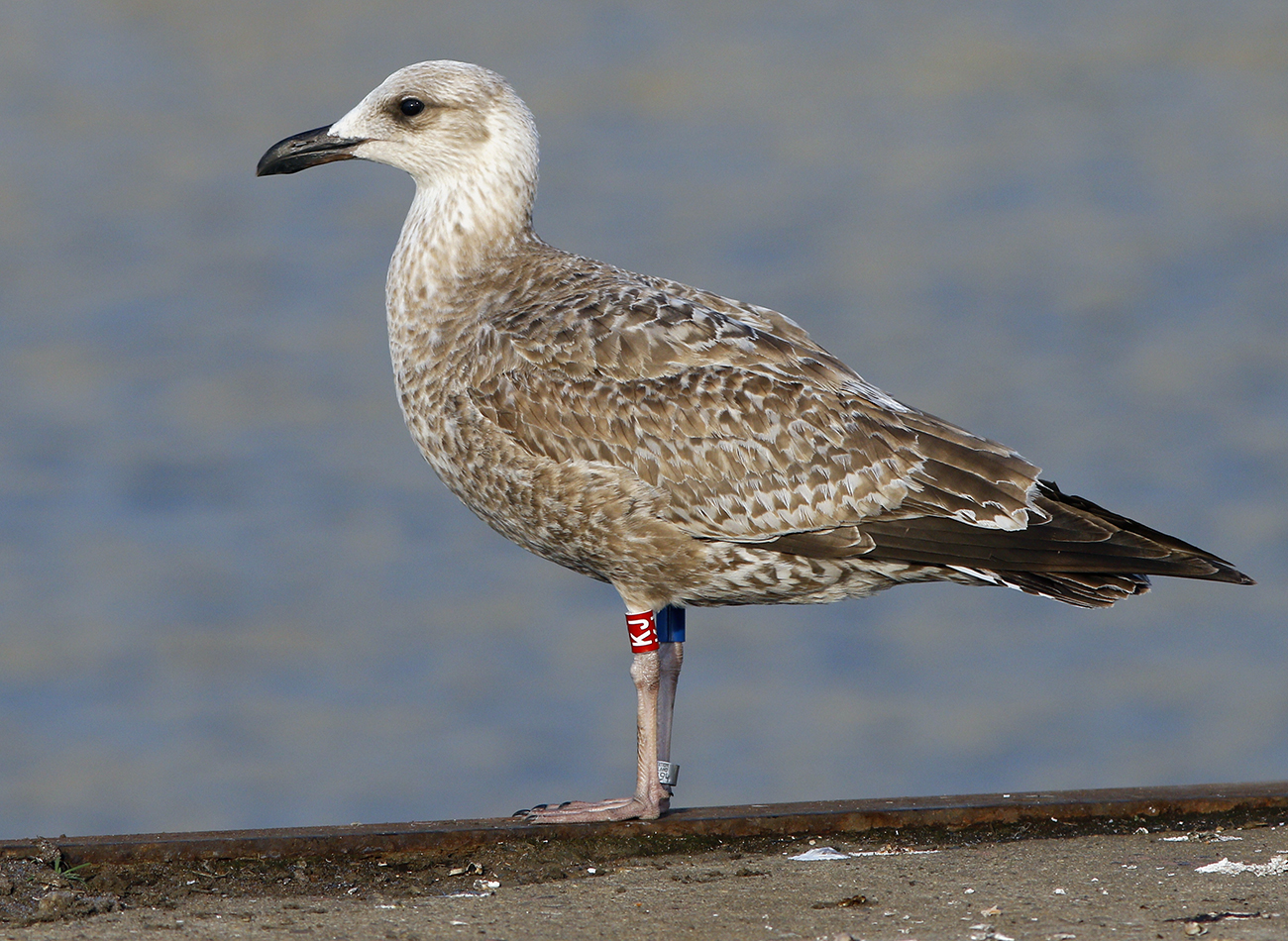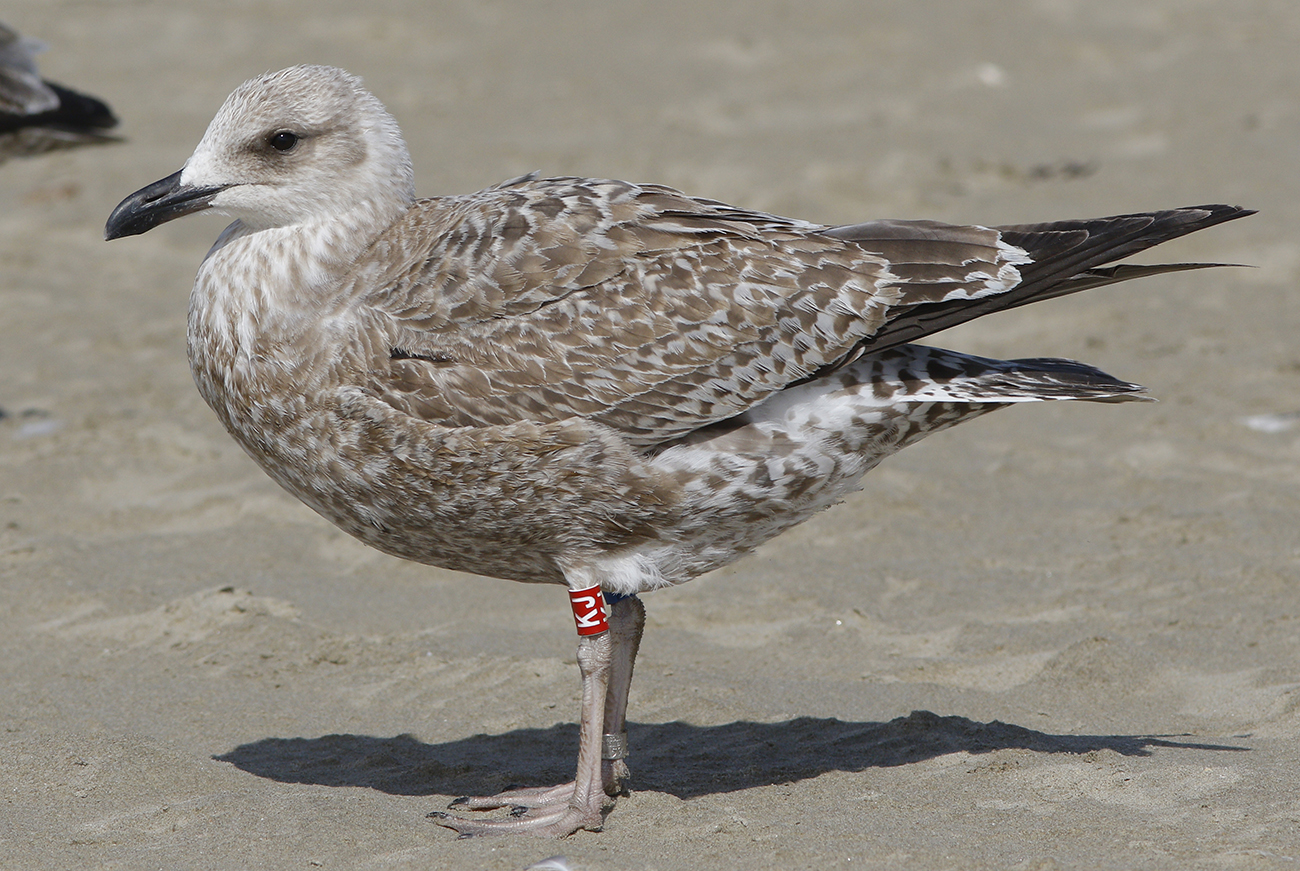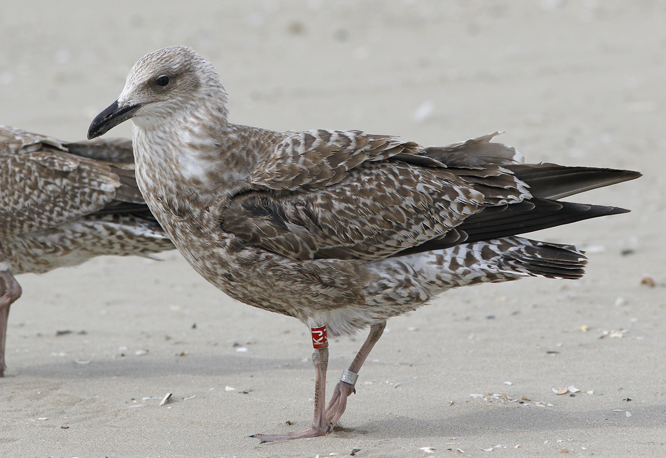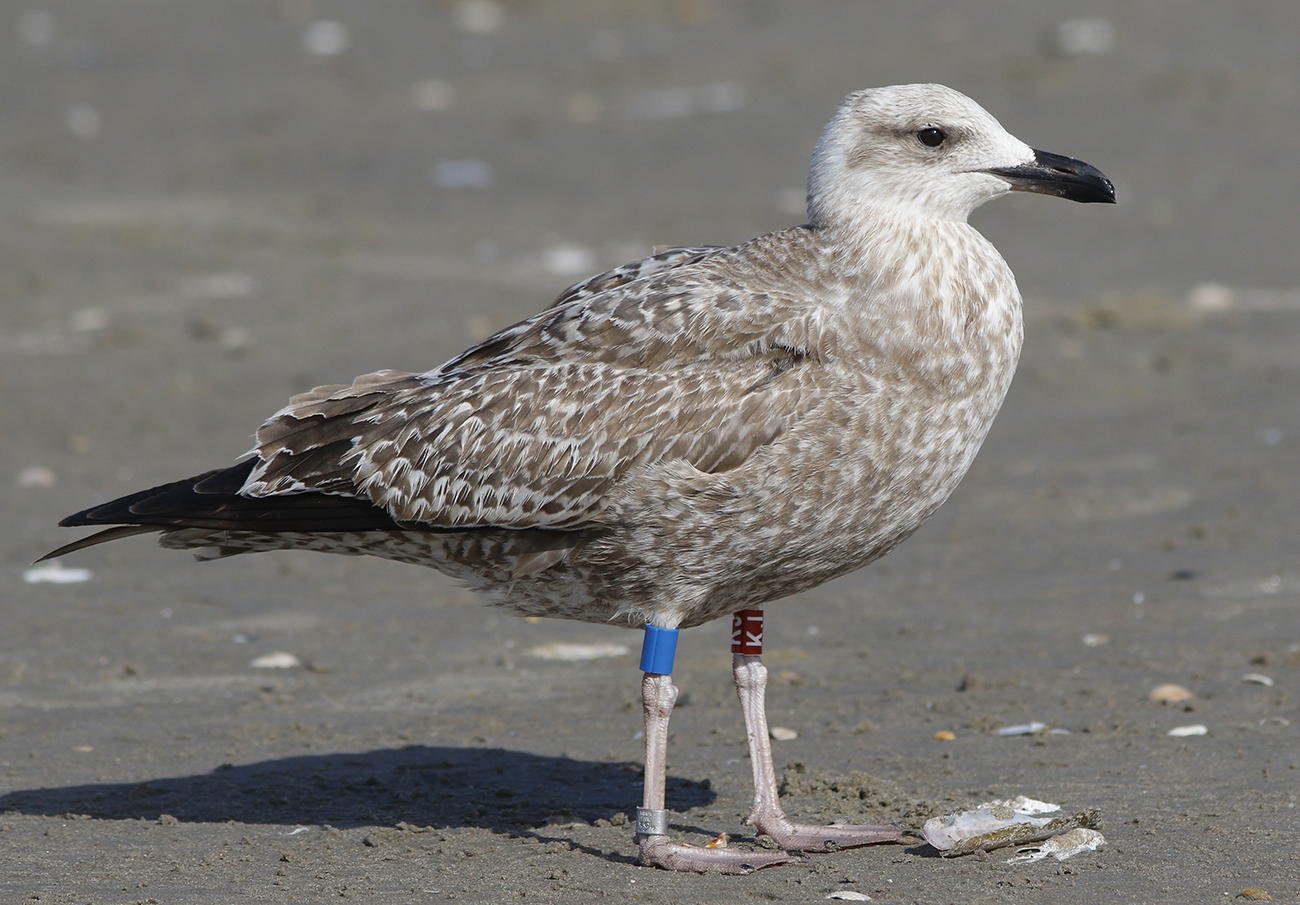 below: Herring Gull argenteus B / KJ 1CY, September 23 2025,  IJmuiden, the Netherlands. Picture: Mars Muusse.