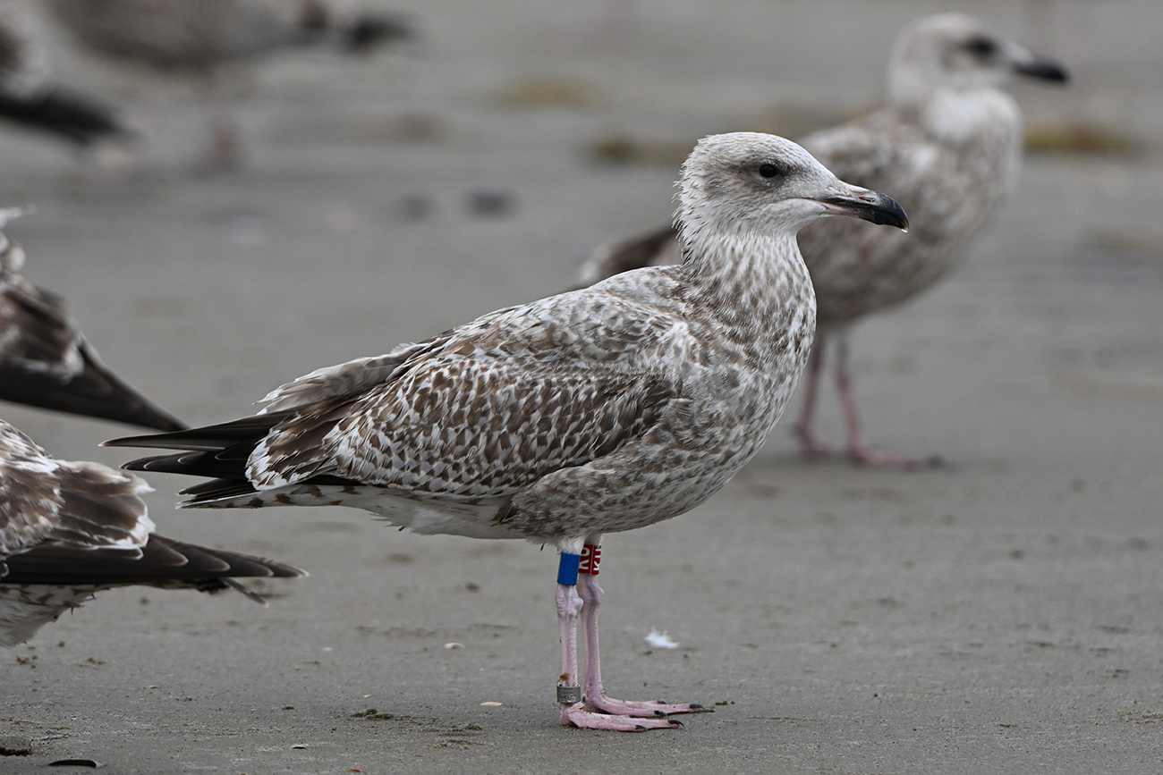 below: Herring Gull argenteus B / KU 1CY, October 08 2025, IJmuiden, the Netherlands. Picture: Thijs Horst.