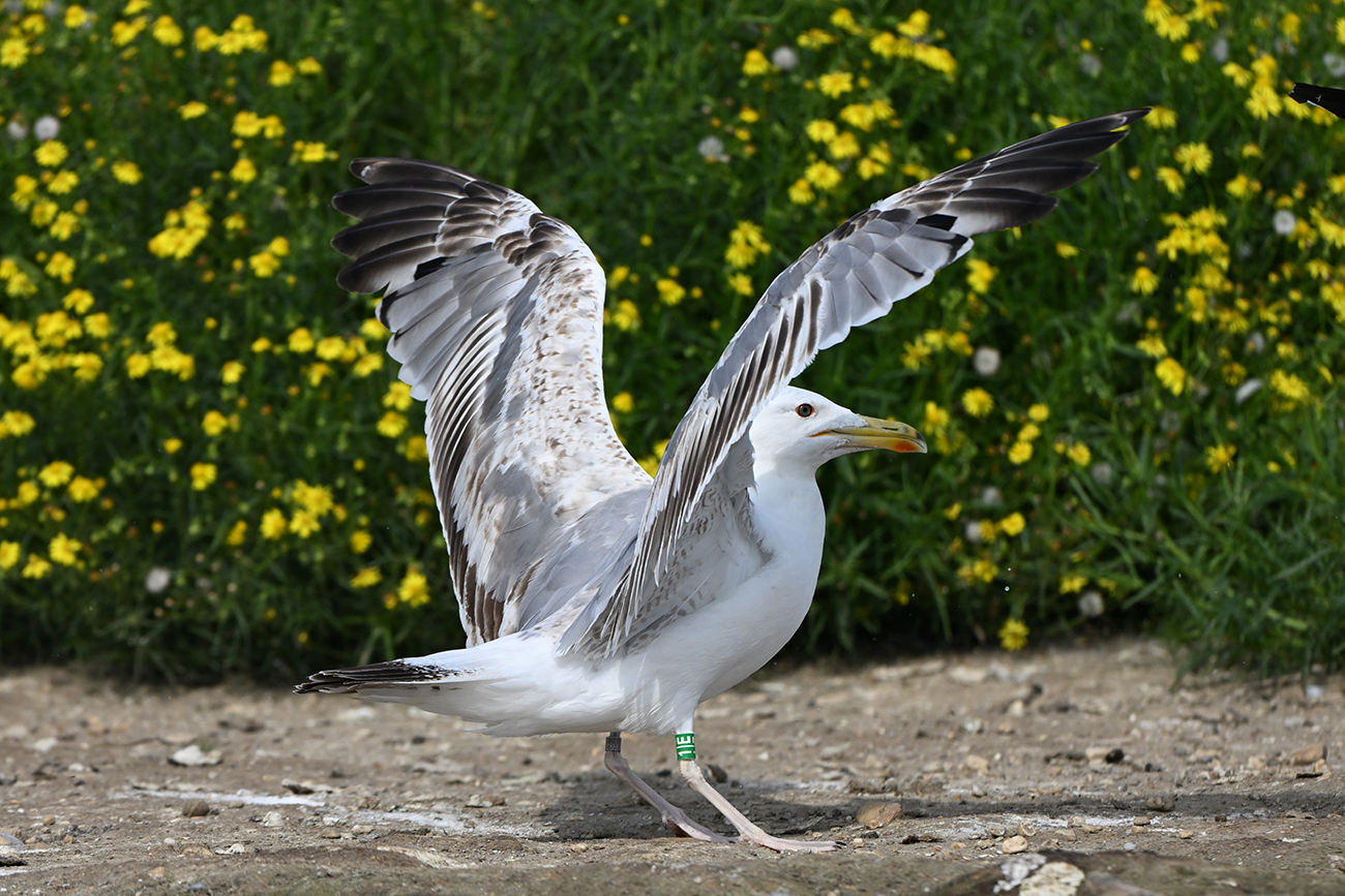 below: Caspian Gull cachinnans 1|E 3CY, April 08 2025, colony De Kreupel, the Netherlands. Picture: Thijs Horst & Mars Muusse.