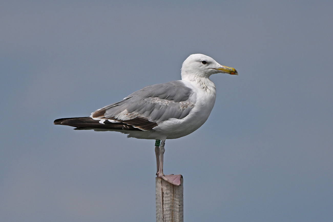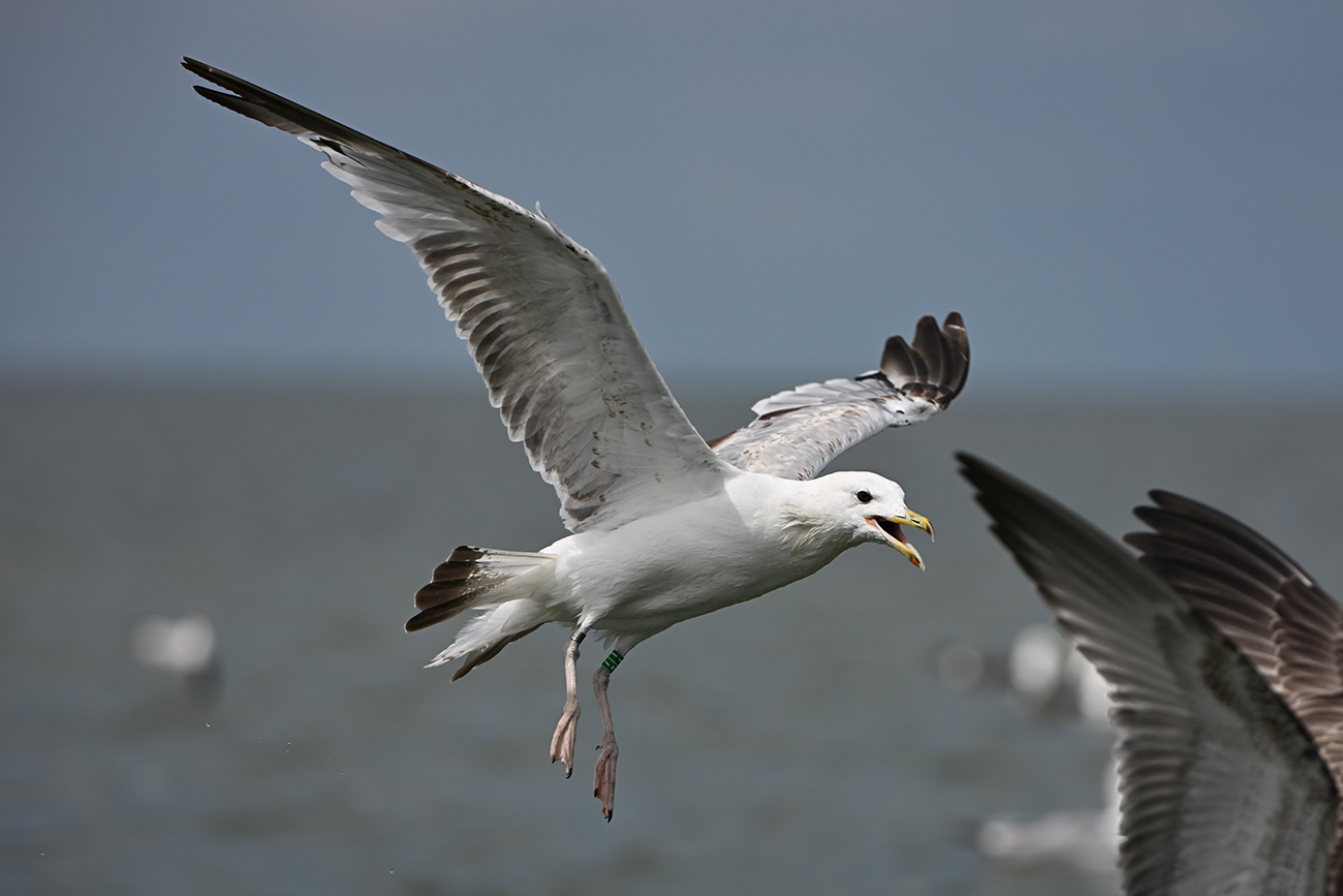 Tibia G-7|1 and metal NLA 5.556.420, ringed as pullus Larus cachinnans on May 27 2023 in nest 253 at Lelystad, the Netherlands (5230.00 N 525.00 E).