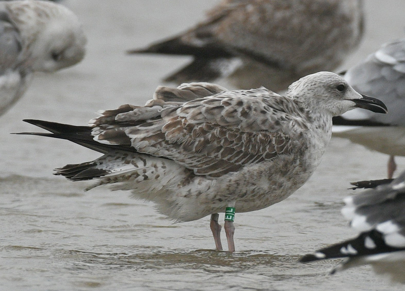 below: Caspian Gull cachinnans E|L 1CY, October 12 2025, Sankt-Peter-Ording, Germany. Picture: Björn Stranz.
