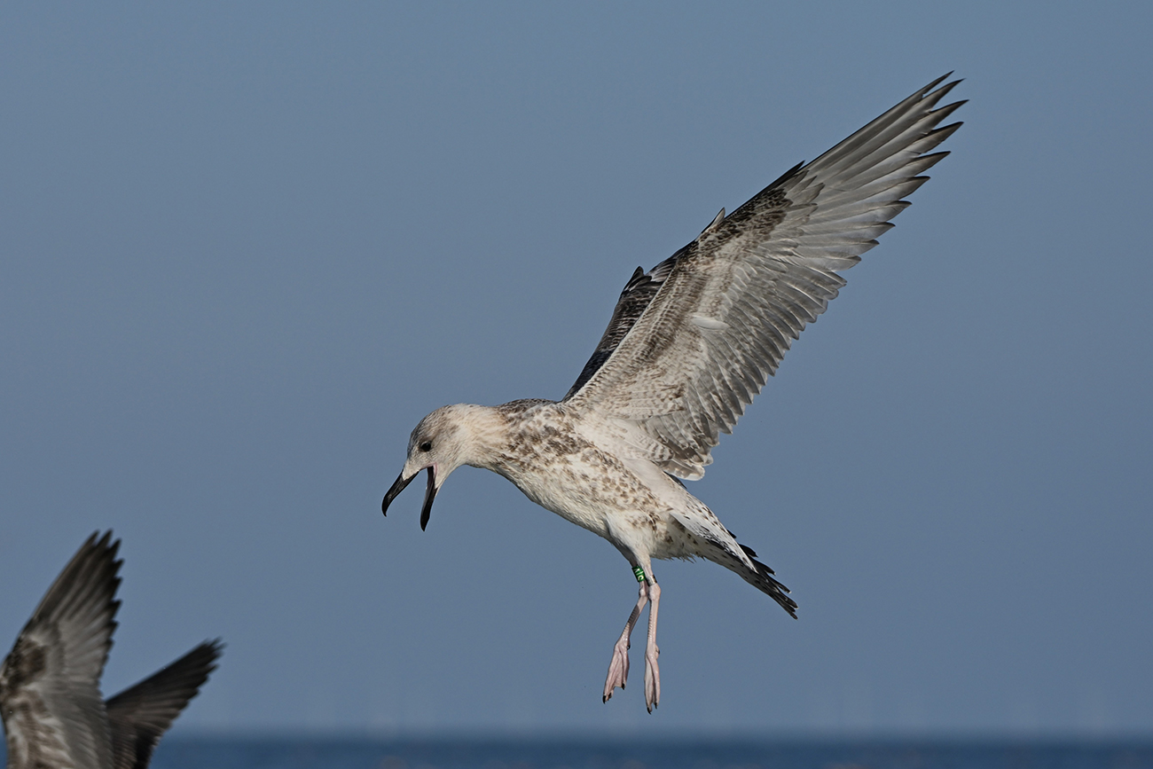 below: Caspian Gull cachinnans S|V 1CY, July 18 2025, colony De Kreupel, the Netherlands. Picture: Thijs Horst & Mars Muusse.