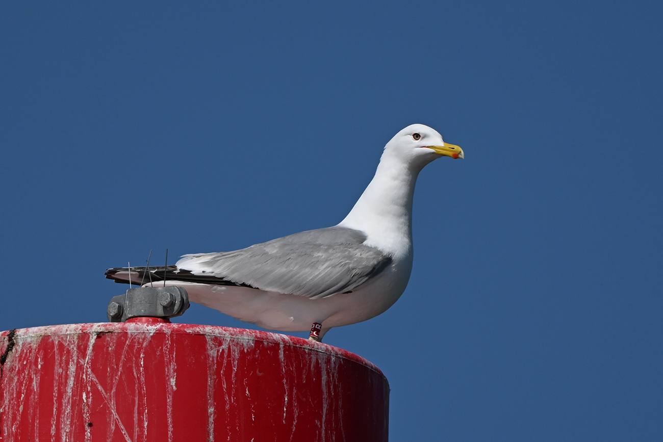 Red tibia ring r[C.B] and metal NLA 5.625.052, ringed as pullus Larus cachinnans at nest 60 on May 09 2022 in colony Lelystad, the Netherlands. Ringer: Roland-Jan Buijs.