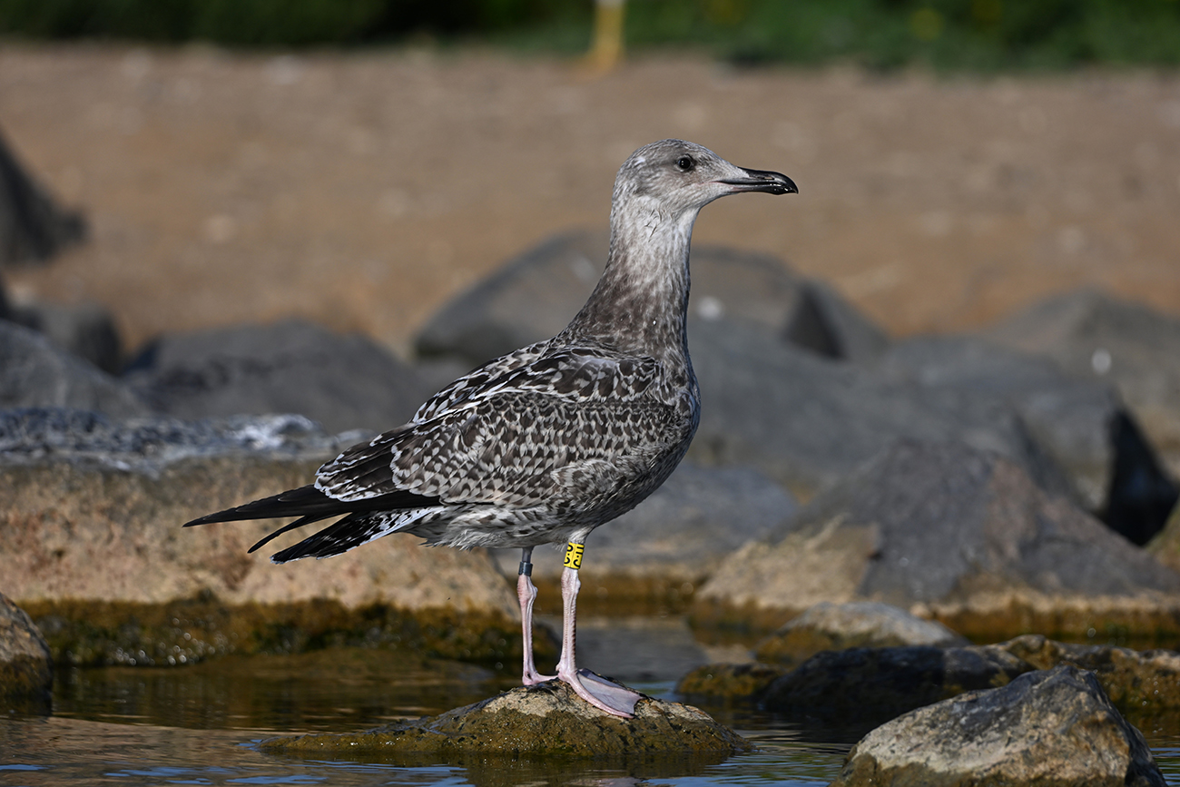 Tibia Y-C:U and metal 5.633.765, ringed as pullus F1-hybrid Larus argentatus x L. cachinnans on May 16 2025 at IJsselmeer (De Kreupel), Noord-Holland, by ringer Leon Kelder.