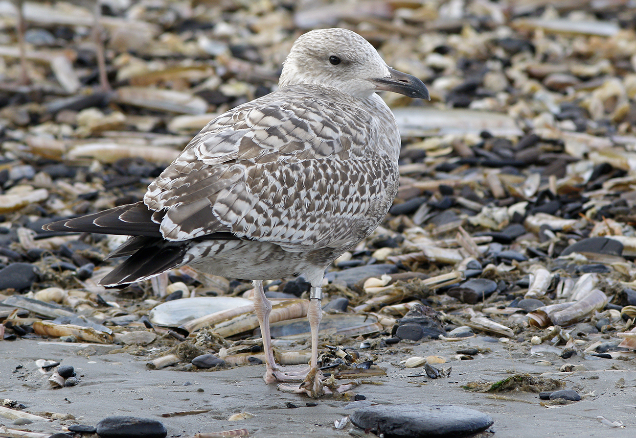 Herring Gull (argenteus) NLA 5.643.014 1CY, September 23 2025, IJmuiden, the Netherlands. Picture: Mars Muusse.Ringed as pullus on May 23 2025, at Forteiland. Ringed by Fred Cottaar ringing team. below: Herring Gull (argenteus) NLA 5.643.014 1CY, September 23 2025, IJmuiden, the Netherlands. Picture: Mars Muusse.
