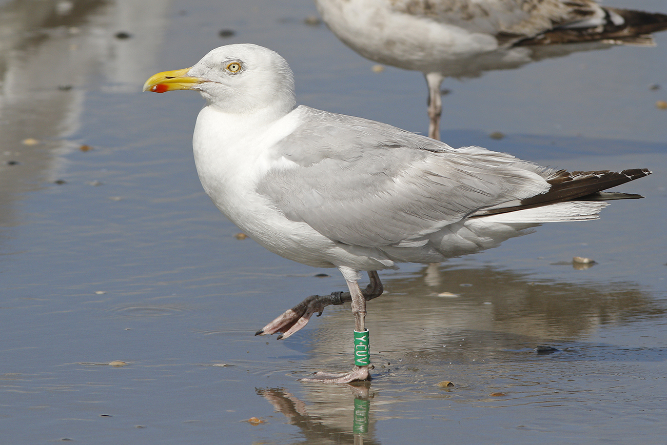 Herring Gull (argenteus) Y.CUV adult, 2020 - 2025, the Netherlands. Picture: Thijs Horst & Mars Muusse.Ringed as breeding adult on May 17 2019 at Forteiland, IJmuiden. Ringed by Fred Cottaar ringing team. below: Herring Gull (argenteus) Y.CUV >10CY, August 07 2025, IJmuiden, the Netherlands. Picture: Mars Muusse.