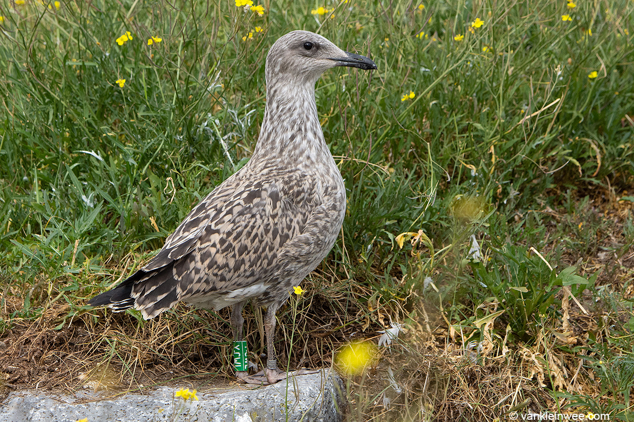 Lesser Black-backed Gull (graellsii) Y.CWL 1CY, July 2019, IJmuiden, the Netherlands.Ringed as pullus in breeding season 2019 at Forteiland, IJmuiden. Ringed by Fred Cottaar ringing team. below: Lesser Black-backed Gull (graellsii) Y.CWL 1CY, July 12 2019, IJmuiden, the Netherlands. Picture: Maarten van Kleinwee.