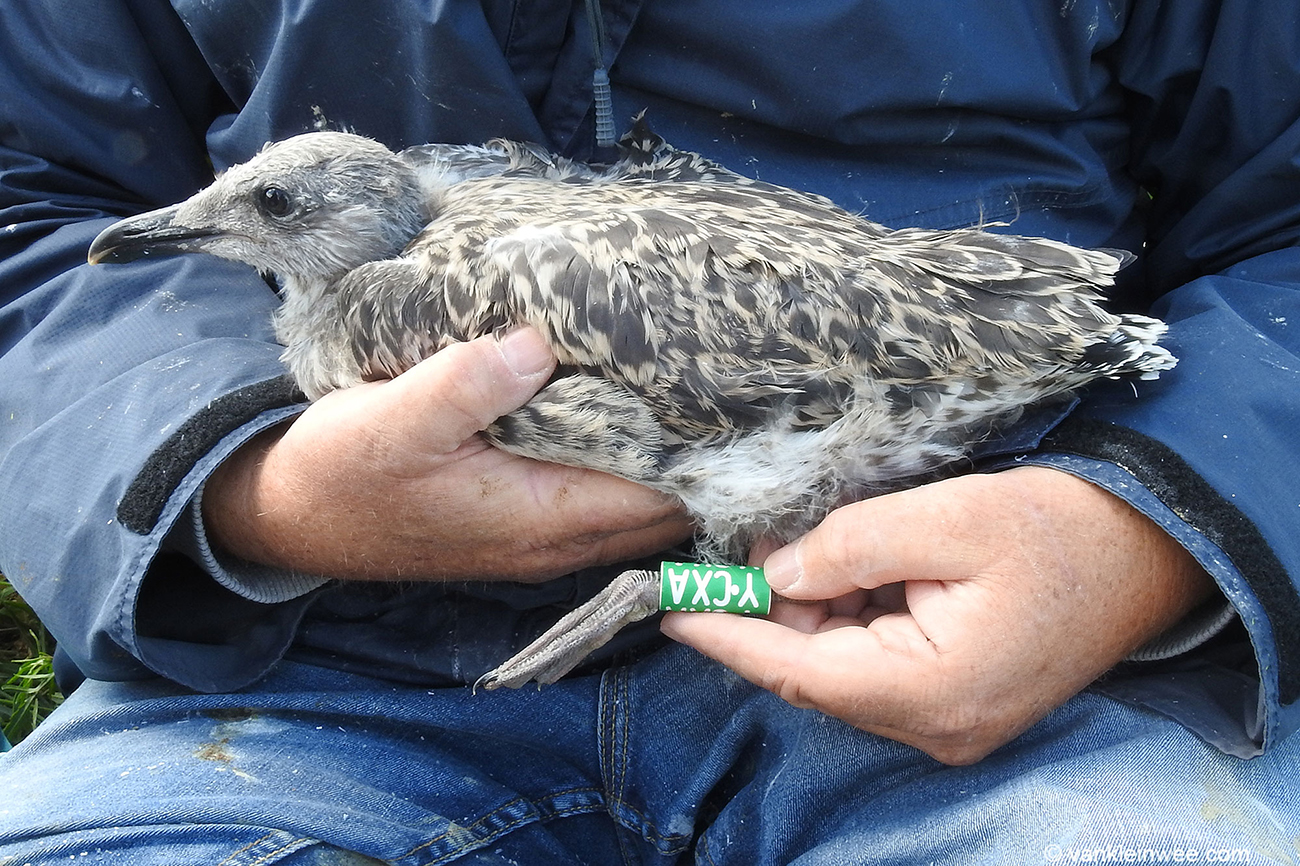 Lesser Black-backed Gull (graellsii) Y.CXA 1CY, July 2019, IJmuiden, the Netherlands.Ringed as pullus in breeding season 2019 at Forteiland, IJmuiden. Ringed by Fred Cottaar ringing team. Last observations: April 2022. below: Lesser Black-backed Gull (graellsii) Y.CXA 1CY, July 01 2019, IJmuiden, the Netherlands. Picture: Maarten van Kleinwee.