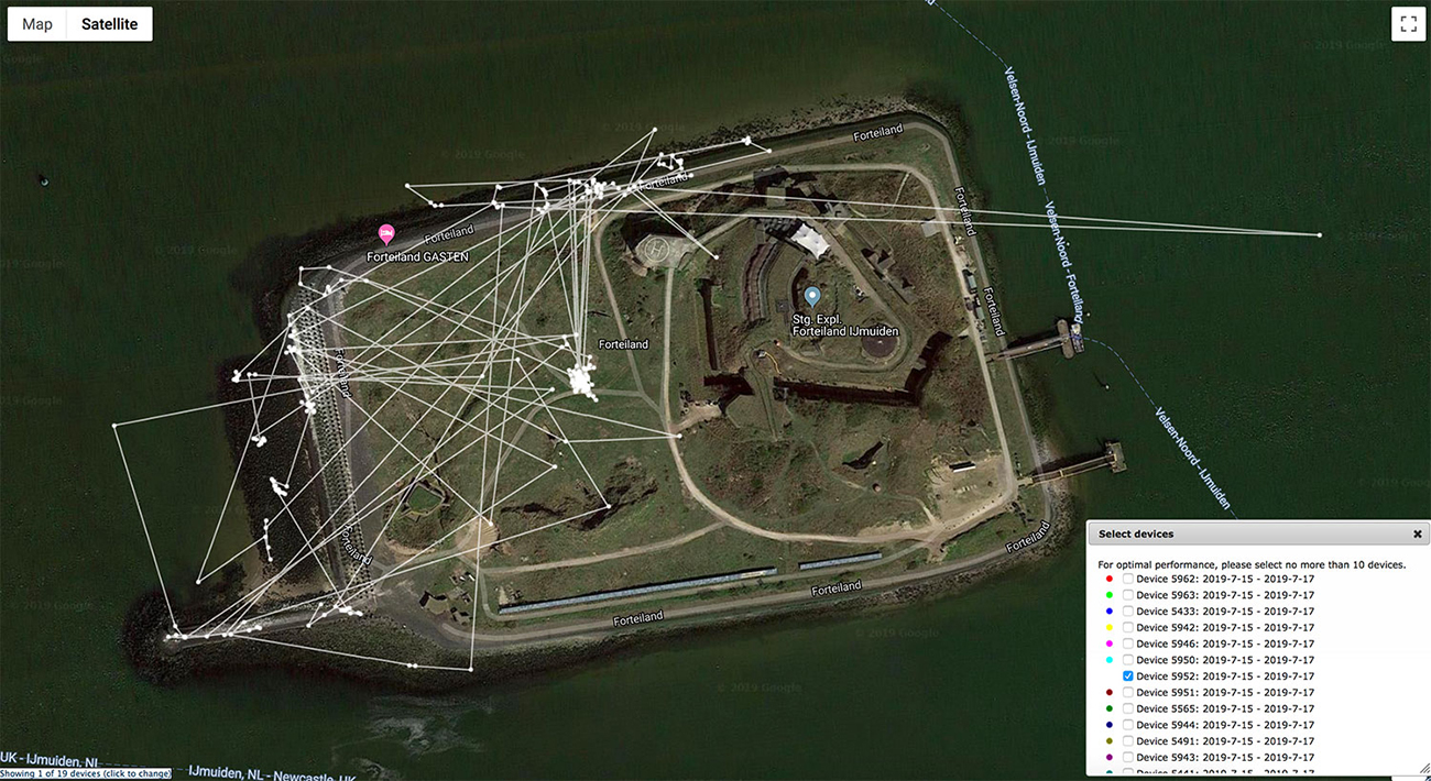 below: Lesser Black-backed Gull (graellsii) Y.CXJ 1CY, July 15-17 2019, IJmuiden, the Netherlands. Plot from UvA Bits GPS logger data.