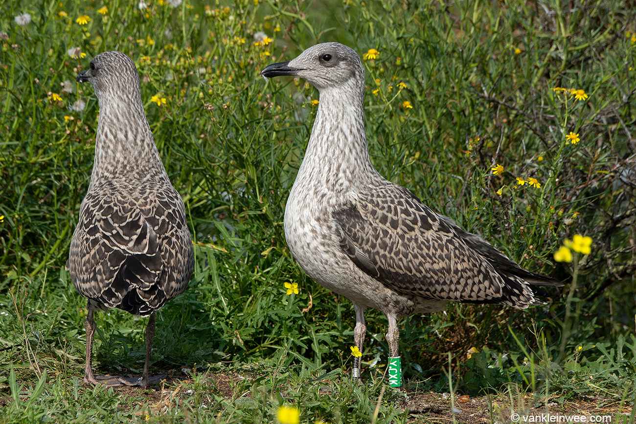 Lesser Black-backed Gull (graellsii) Y.CXK 1CY, 2019-2023, IJmuiden, the Netherlands. Picture: ringing team IJmuiden.Ringed as pullus in breeding season 2019 at Forteiland, IJmuiden. Ringed by Fred Cottaar ringing team. below: Lesser Black-backed Gull (graellsii) Y.CXK 5CY, May 15 2023, IJmuiden, the Netherlands. Picture: Mars Muusse.below: Lesser Black-backed Gull (graellsii) Y.CXK 1CY, July 12 2019, IJmuiden, the Netherlands. Picture: Maarten van Kleinwee.