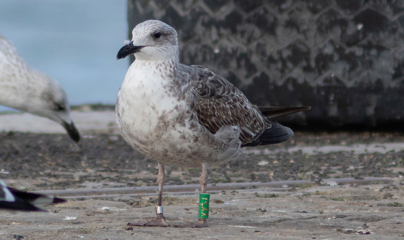 Lesser Black-backed Gull (graellsii) Y.CXX 1CY-2CY, 2019-2020, the Netherlands & Spain.Ringed as pullus in breeding season 2019 at Forteiland, IJmuiden. Ringed by Fred Cottaar ringing team. below: Lesser Black-backed Gull (graellsii) Y.CXX 2CY, March 01 2020, Málaga, Spain. Picture: Salva García Barcelona.
