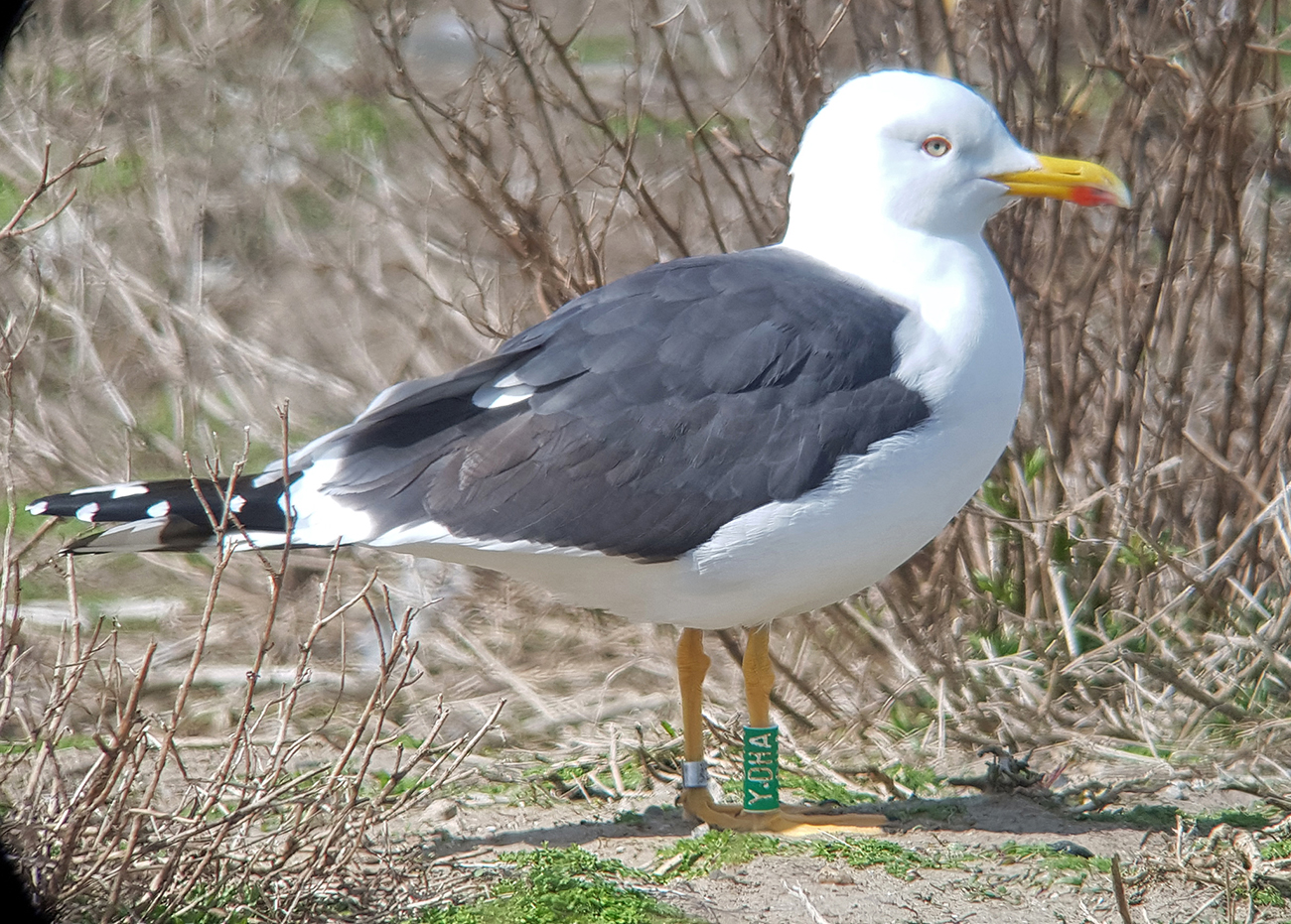 Lesser Black-backed Gull (graellsii) Y.DHA adult, 2021 - 2023, the Netherlands. Picture: José Verbeek-Cottaar & Maarten van Kleinwee.Ringed as pullus in season 2010 at at Forteiland, IJmuiden. Ringed by Fred Cottaar ringing team. below: Lesser Black-backed Gull (graellsii) Y.DHA 14CY, March 27 2023, IJmuiden, the Netherlands. Picture: José Verbeek-Cottaar.
