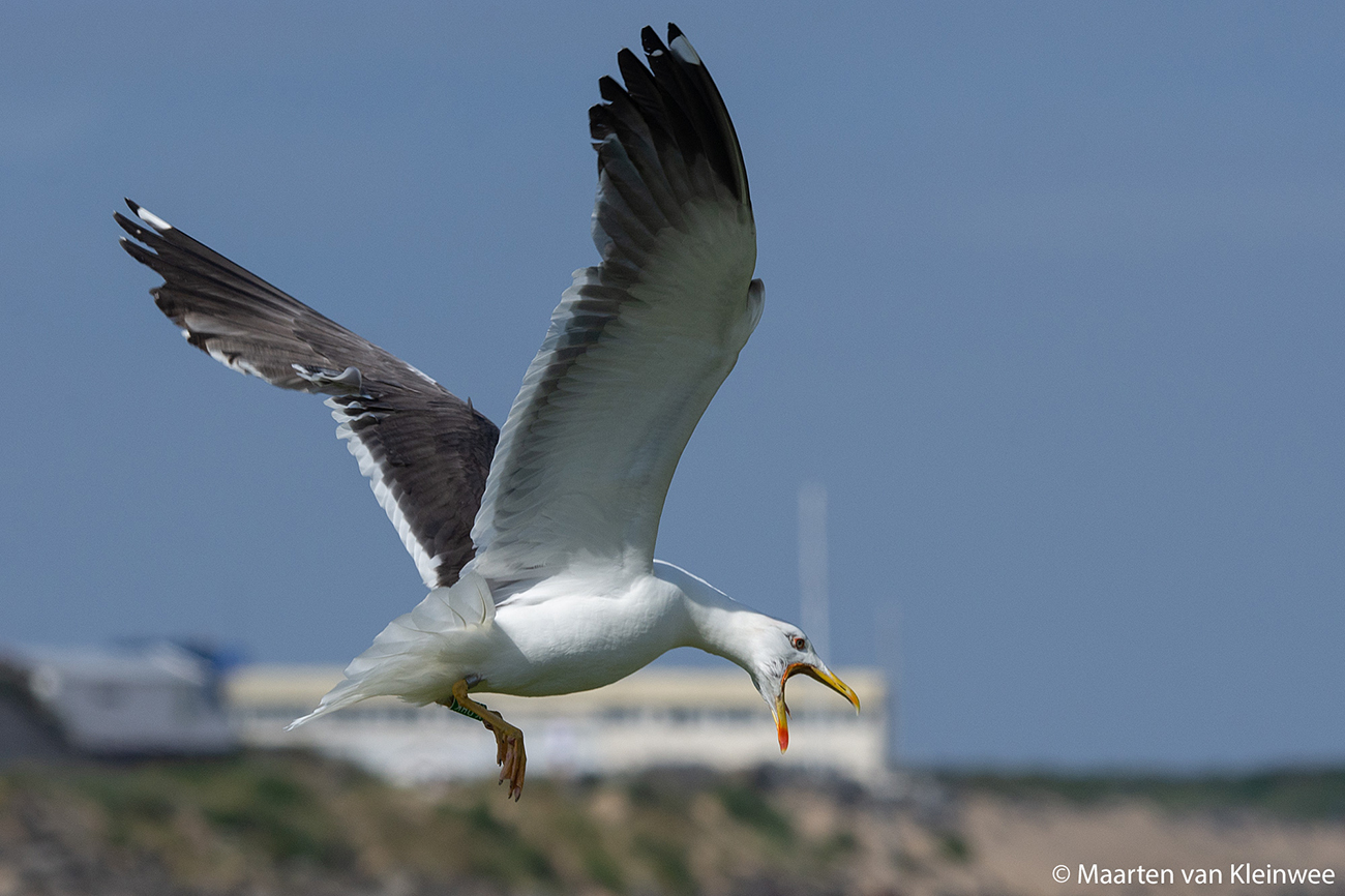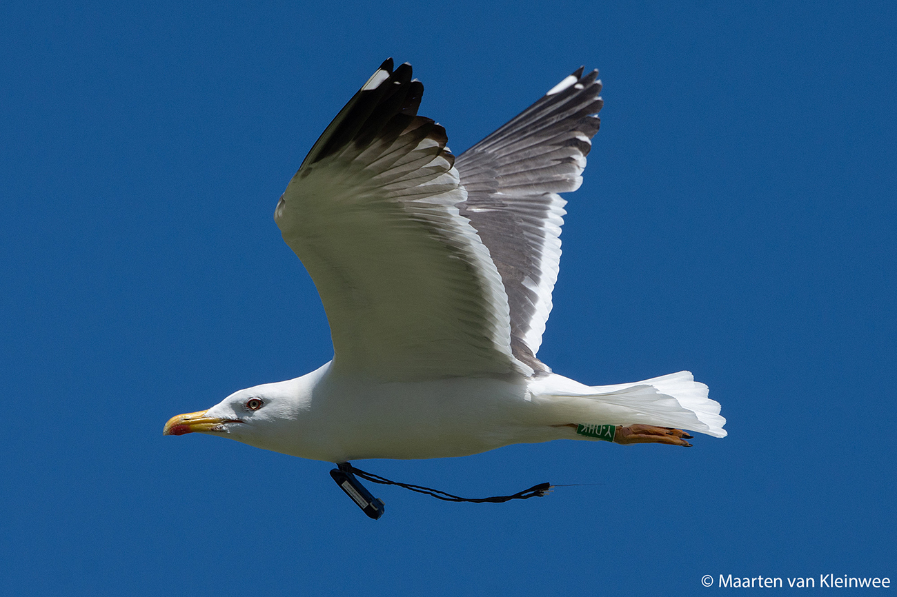below: Lesser Black-backed Gull (graellsii) Y.DHK 24CY, June 24 2021, IJmuiden, the Netherlands. Picture: Maarten van Kleinwee.Within 4 weeks, the logger already came off.