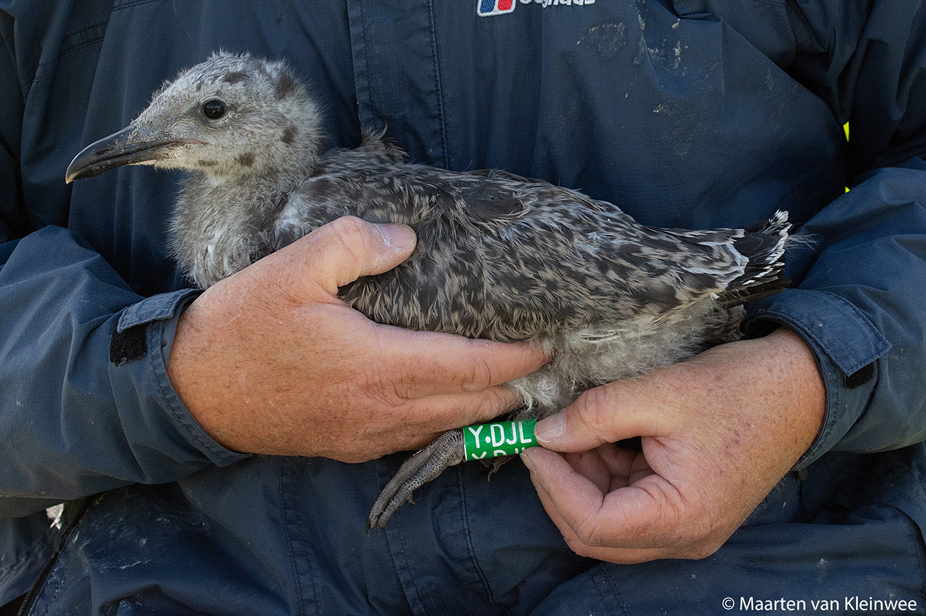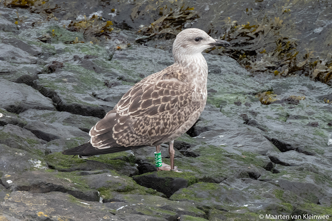 below: Lesser Black-backed Gull (graellsii) Y.DJL 1CY, June 24 2021, IJmuiden, the Netherlands. Picture: Maarten van Kleinwee.