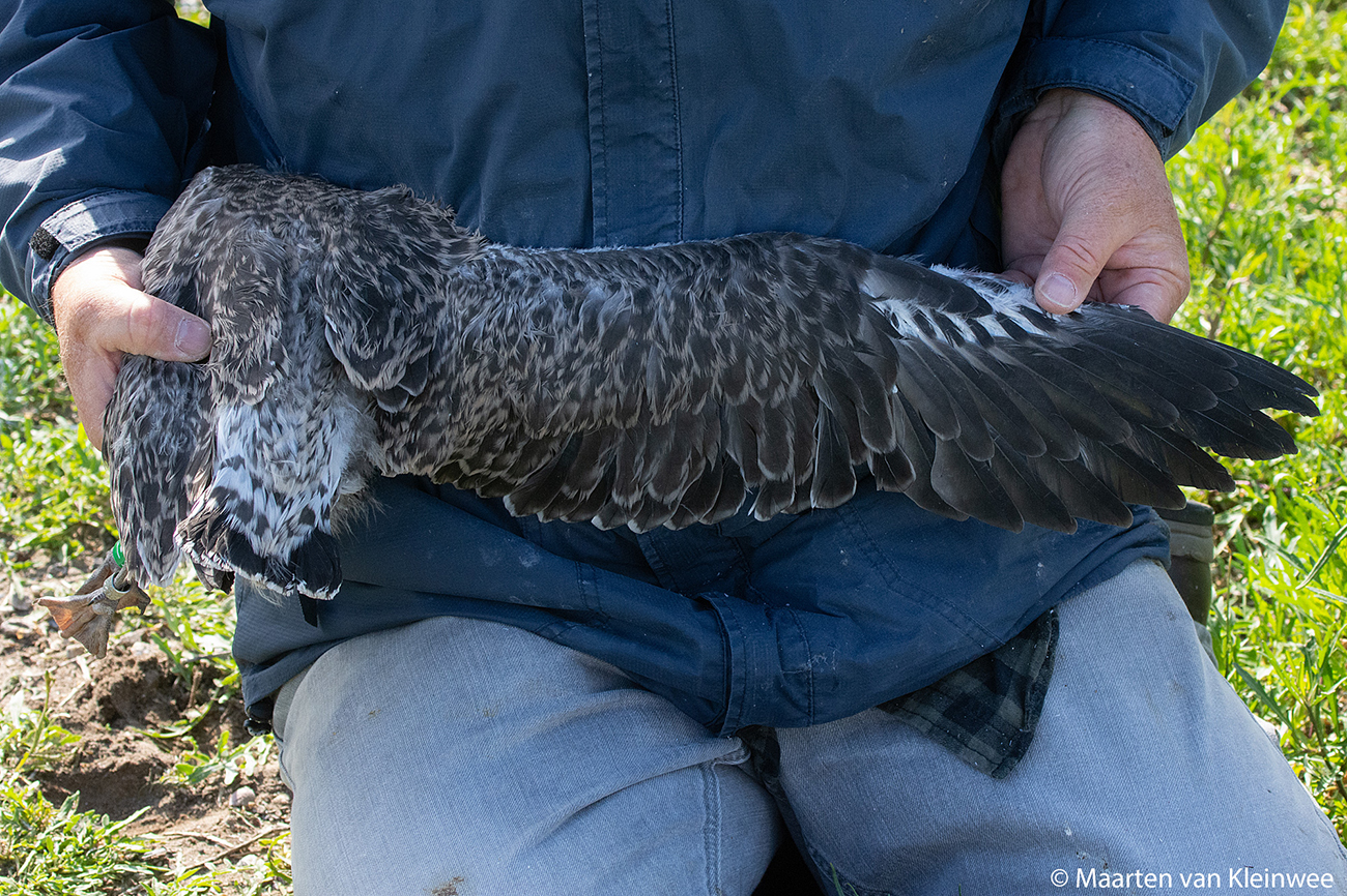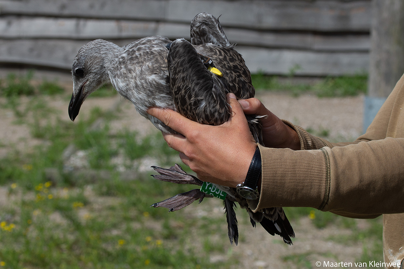 below: Lesser Black-backed Gull (graellsii) Y.DJL 1CY, July 02 2021, IJmuiden, the Netherlands. Picture: Maarten van Kleinwee.Logger fitted.