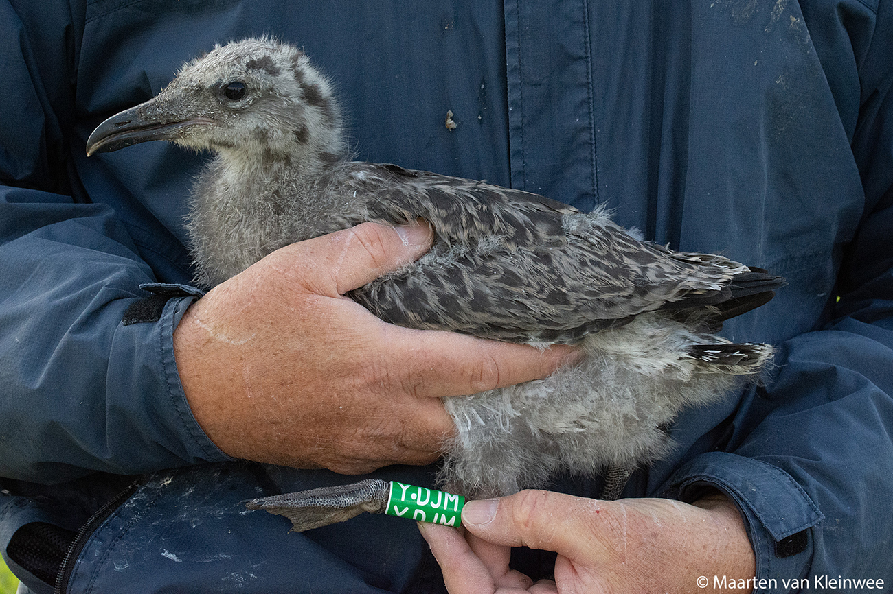 Lesser Black-backed Gull (graellsii) Y.DJM 1CY, 2021, IJmuiden, the Netherlands. Picture: IJmuiden ringing team.Ringed as pullus in breeding season 2021 at Forteiland, IJmuiden. Ringed by Fred Cottaar ringing team. Logger bird, GPS fitted in 2021: #7016. Last observation: year 2023 in Spain. below: Lesser Black-backed Gull (graellsii) Y.DJM 1CY, July 05 2021, IJmuiden, the Netherlands. Picture: Maarten van Kleinwee.