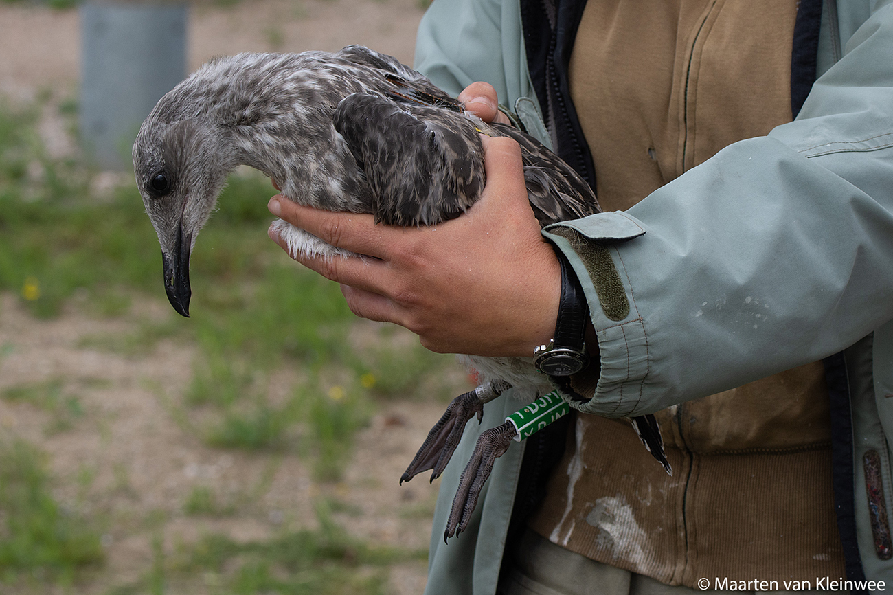 below: Lesser Black-backed Gull (graellsii) Y.DJM 1CY, July 02 2021, IJmuiden, the Netherlands. Picture: Maarten van Kleinwee.Logger fitted.
