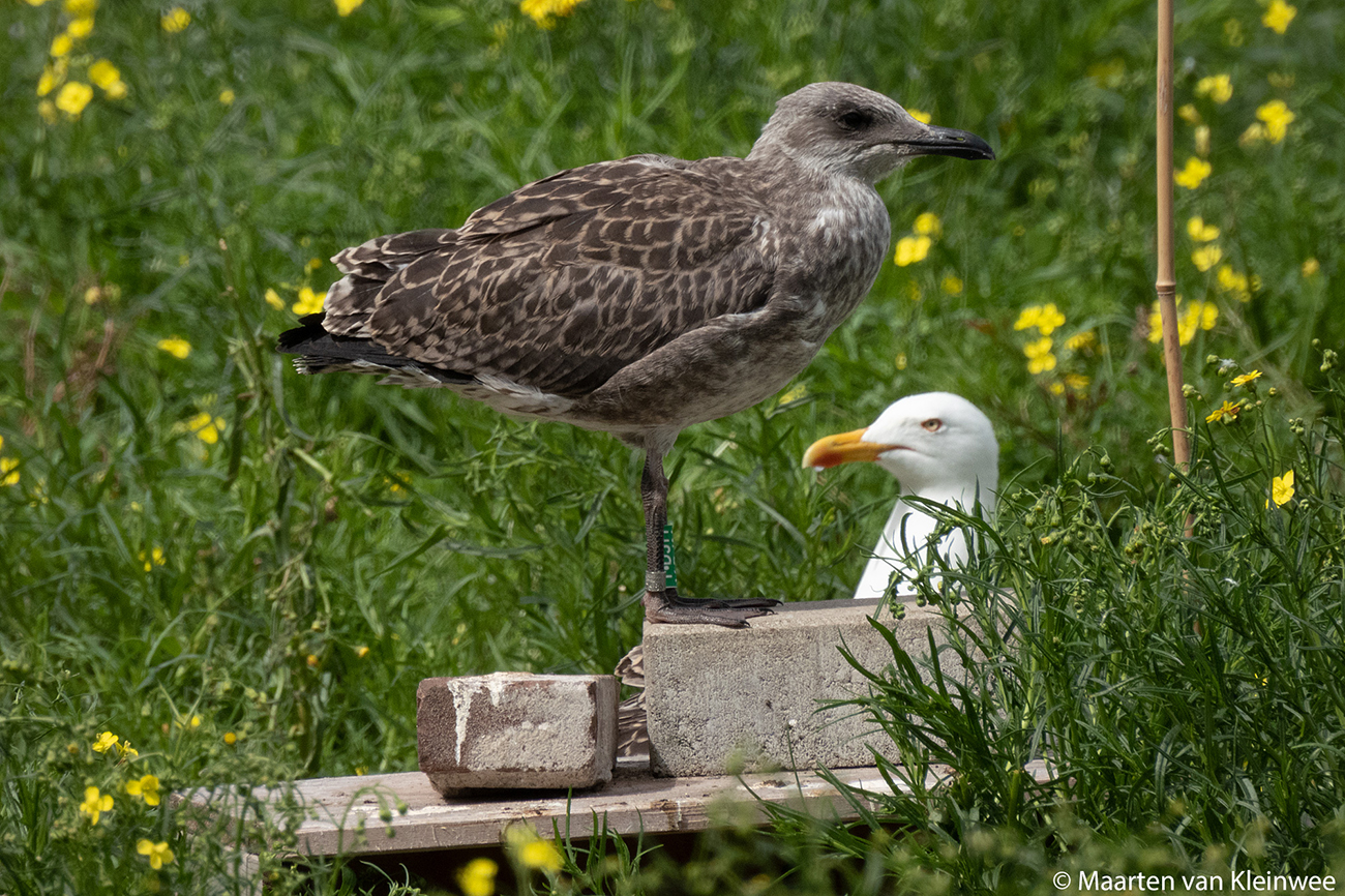 below: Lesser Black-backed Gull (graellsii) Y.DJM 1CY, June 24 2021, IJmuiden, the Netherlands. Picture: Maarten van Kleinwee.