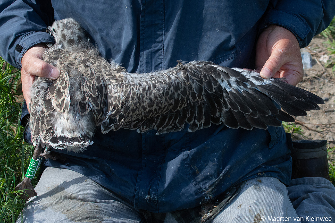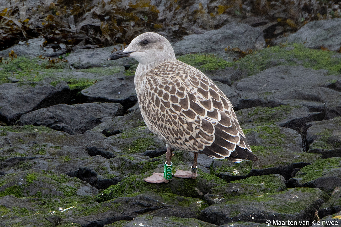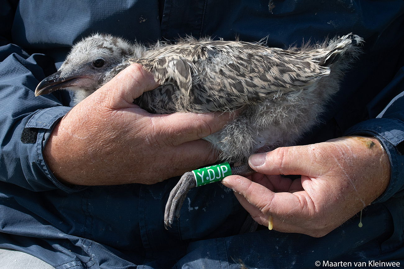 below: Lesser Black-backed Gull (graellsii) Y.DJP 1CY, June 24 2021, IJmuiden, the Netherlands. Picture: Maarten van Kleinwee.