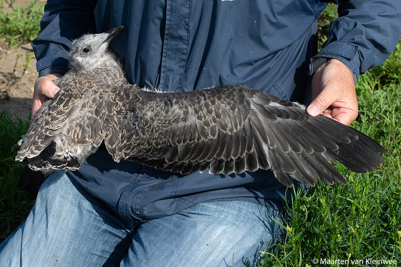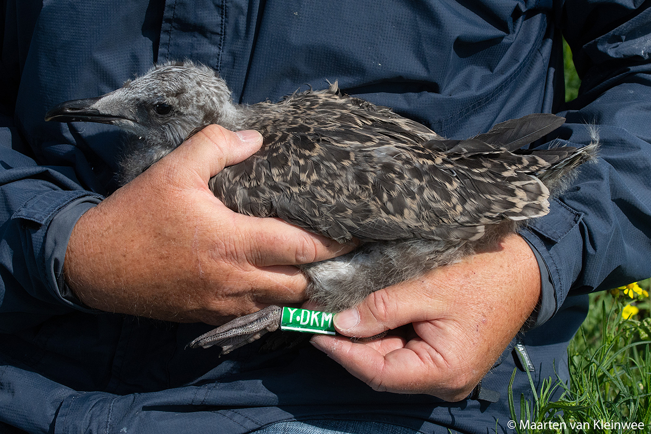 below: Lesser Black-backed Gull (graellsii) Y.DKM 1CY, June 28 2021, IJmuiden, the Netherlands. Picture: Maarten van Kleinwee.