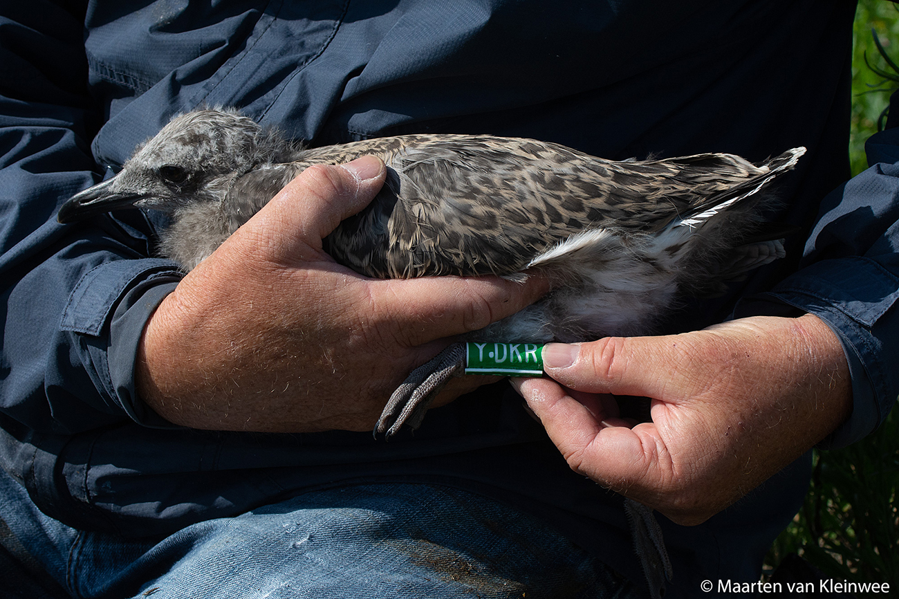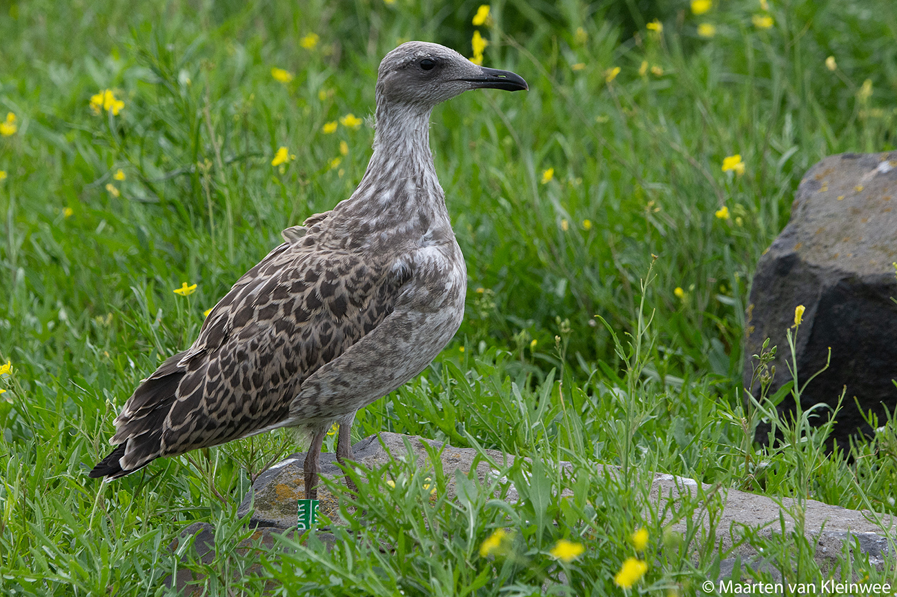 below: Lesser Black-backed Gull (graellsii) Y.DKR 1CY, June 28 2021, IJmuiden, the Netherlands. Picture: Maarten van Kleinwee.