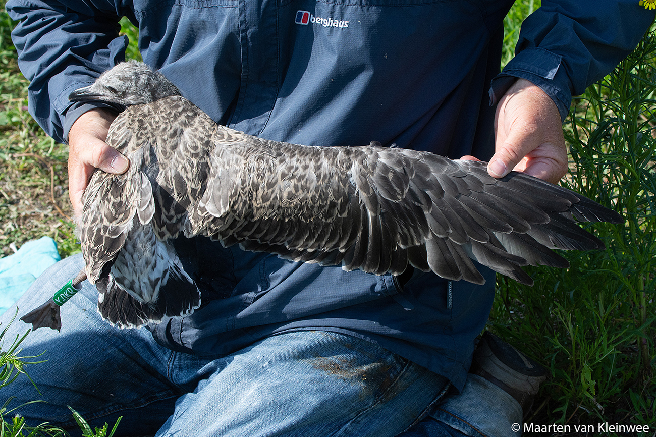 below: Lesser Black-backed Gull (graellsii) Y.DKR 1CY, July 02 2021, IJmuiden, the Netherlands. Picture: Maarten van Kleinwee.Logger fitted.