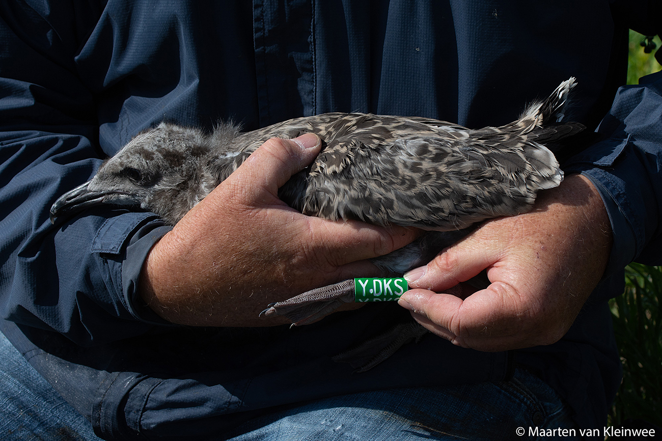 below: Lesser Black-backed Gull (graellsii) Y.DKS 1CY, June 28 2021, IJmuiden, the Netherlands. Picture: Maarten van Kleinwee.