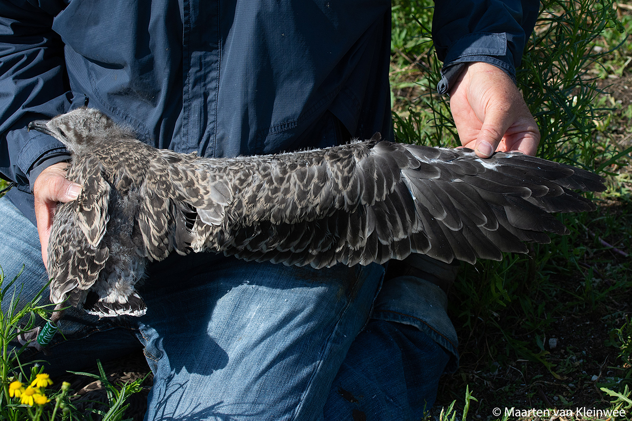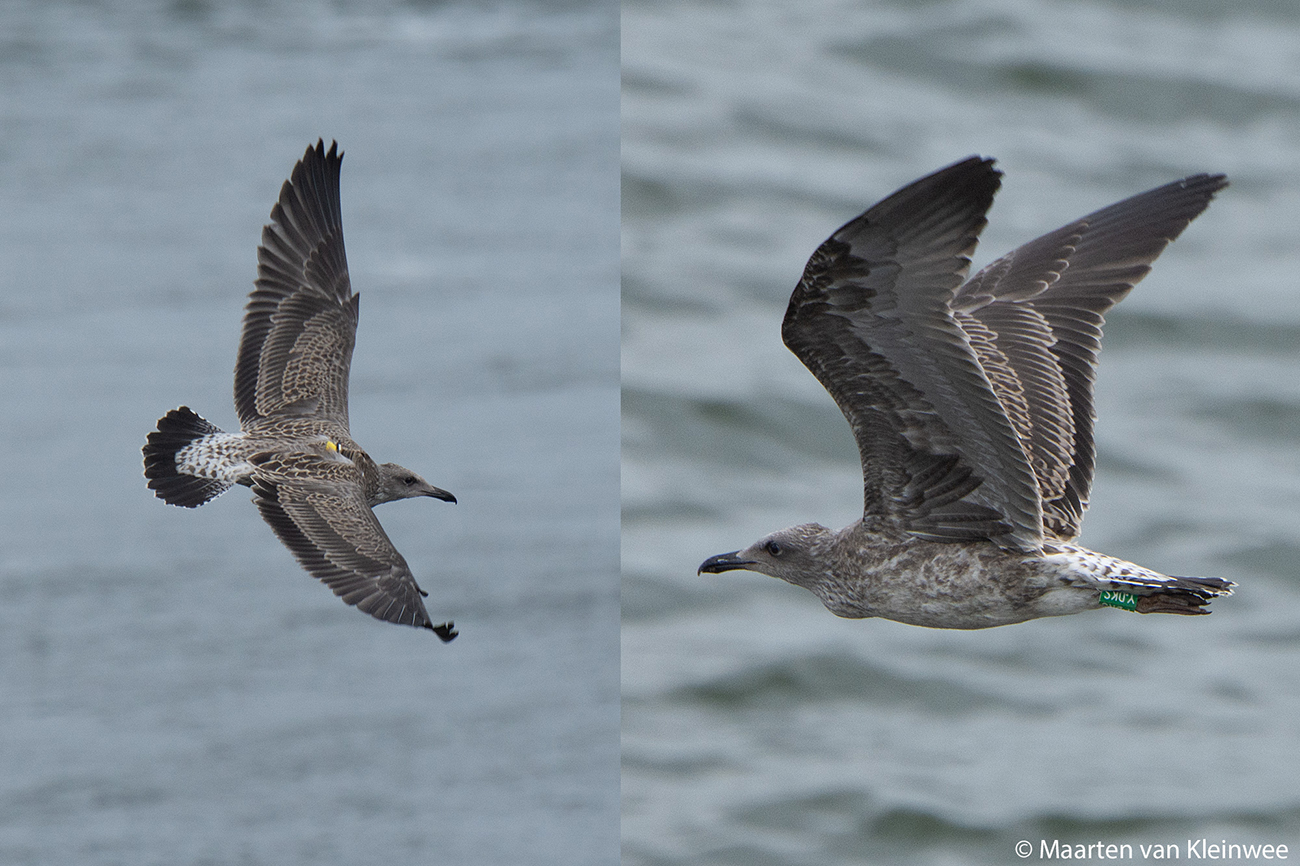 below: Lesser Black-backed Gull (graellsii) Y.DKS 1CY, July 02 2021, IJmuiden, the Netherlands. Picture: Maarten van Kleinwee.Logger fitted.