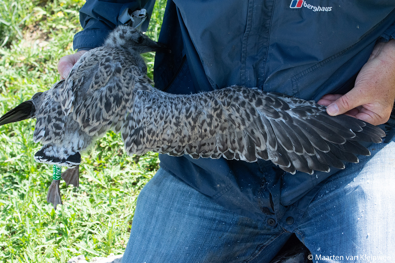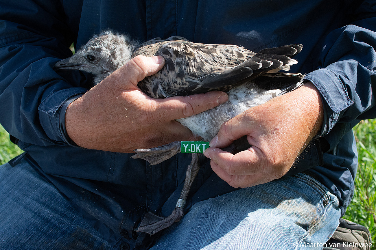 below: Lesser Black-backed Gull (graellsii) Y.DKT 1CY, July 16 2021, IJmuiden, the Netherlands. Picture: Maarten van Kleinwee.