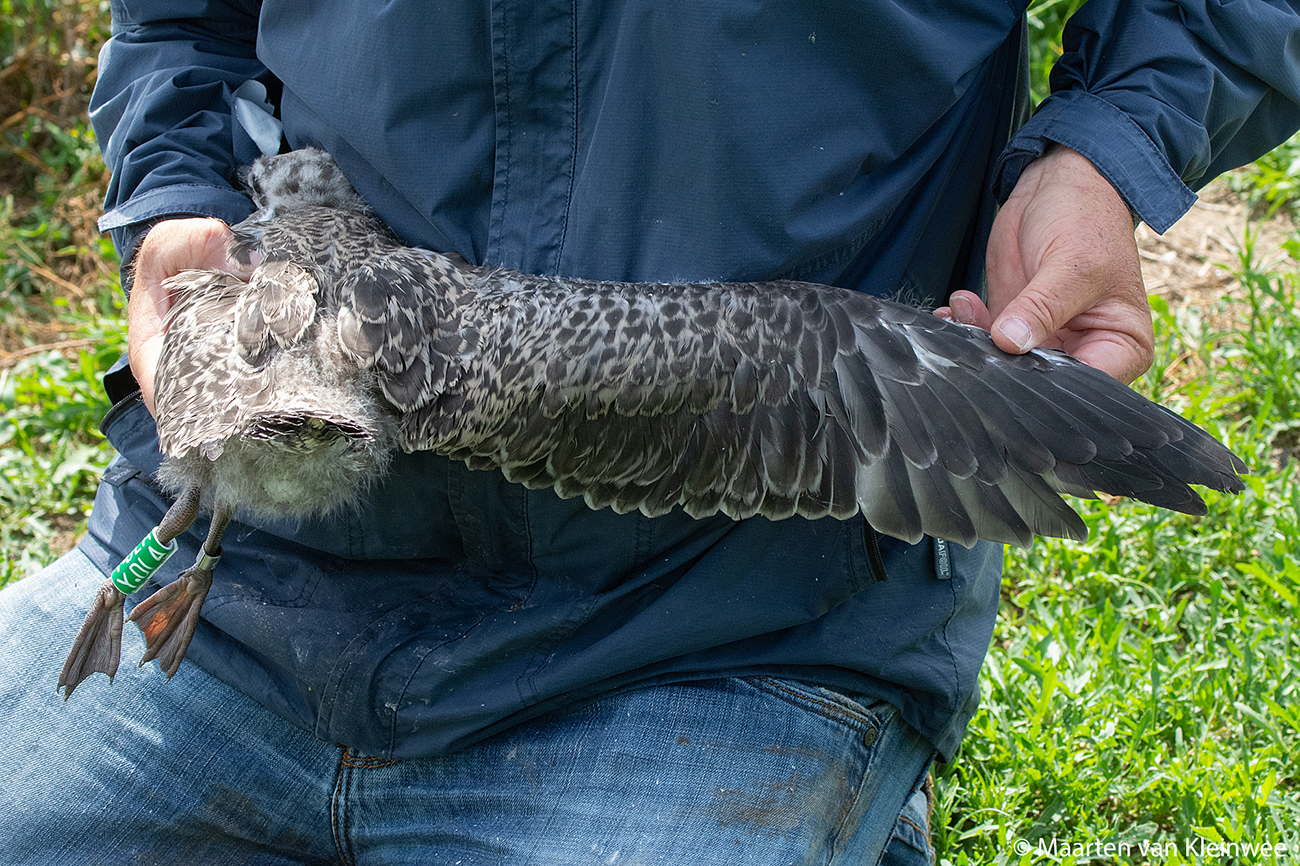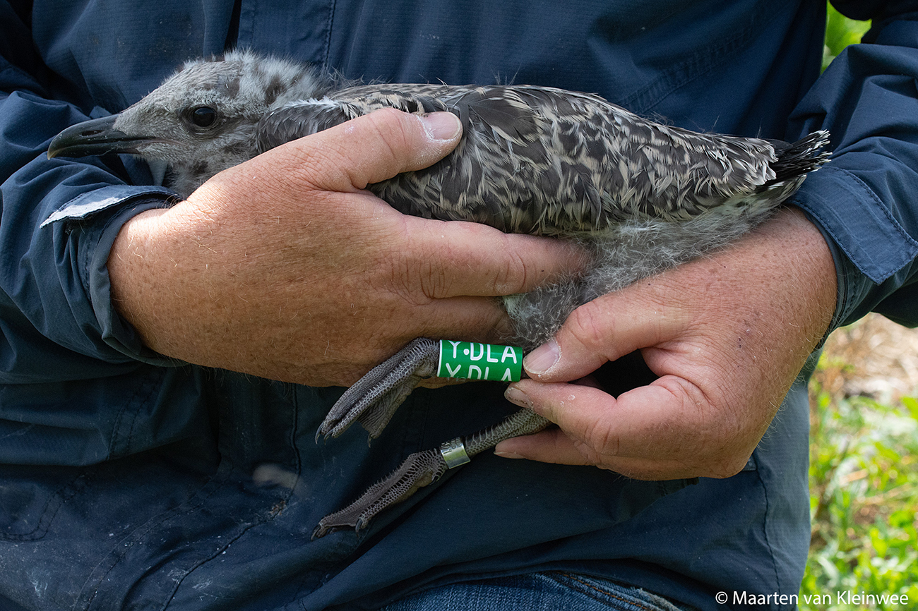 Lesser Black-backed Gull (graellsii) Y.DLA 1CY, 2021, IJmuiden, the Netherlands. Picture: IJmuiden ringing team.Ringed as pullus in breeding season 2021 at Forteiland, IJmuiden. Ringed by Fred Cottaar ringing team. Last observation: year 2021. below: Lesser Black-backed Gull (graellsii) Y.DLA 1CY, June 28 2021, IJmuiden, the Netherlands. Picture: Maarten van Kleinwee.