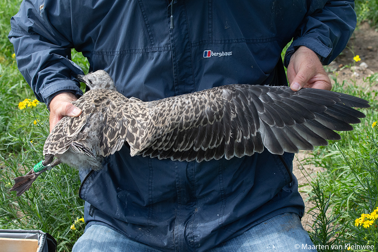 Lesser Black-backed Gull (graellsii) Y.DLB 1CY, 2021, IJmuiden, the Netherlands. Picture: IJmuiden ringing team.Ringed as pullus in breeding season 2021 at Forteiland, IJmuiden. Ringed by Fred Cottaar ringing team. below: Lesser Black-backed Gull (graellsii) Y.DLB 1CY, June 28 2021, IJmuiden, the Netherlands. Picture: Maarten van Kleinwee.