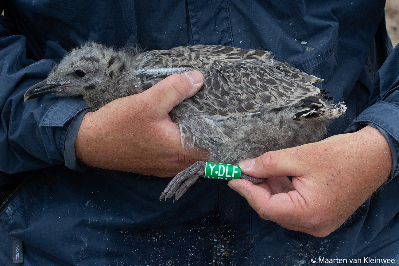 Lesser Black-backed Gull (graellsii) Y.DLF 1CY, 2021, IJmuiden, the Netherlands. Picture: IJmuiden ringing team.Ringed as pullus in breeding season 2021 at Forteiland, IJmuiden. Ringed by Fred Cottaar ringing team. Found dead in 2021 in the colony. below: Lesser Black-backed Gull (graellsii) Y.DLF 1CY, June 28 2021, IJmuiden, the Netherlands. Picture: Maarten van Kleinwee.At Centrale Vlak.